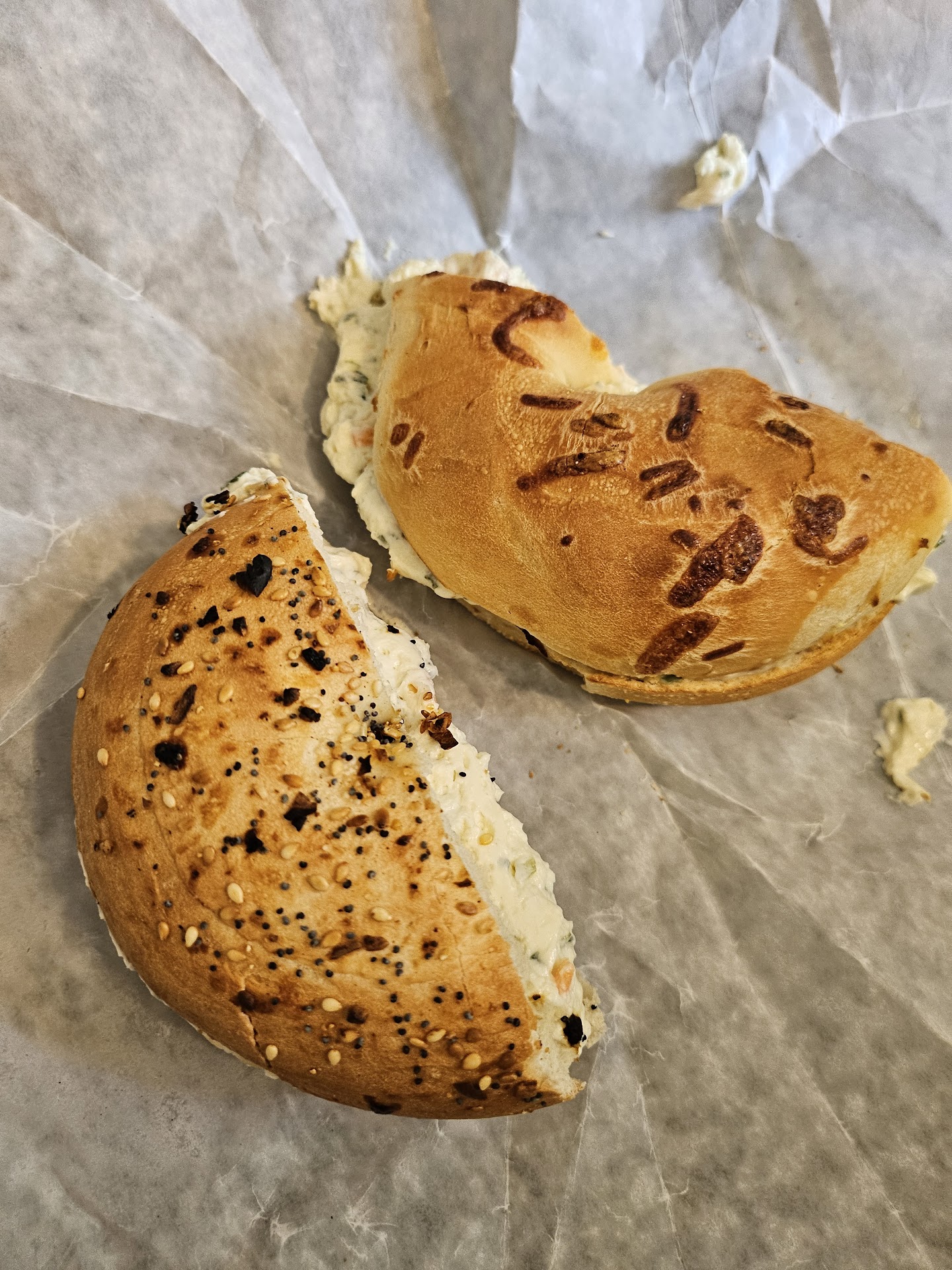 These bagels I had today were pretty pathetic. The grocery story bakery bagels I get at Shaw's taste better and had more chew and taste to them. The outside crust just crumbles and the inside just tastes like bread. Everything bagel is just burnt garlic and onion with no salt. I can't stand when everything bagels have no salt. Cheese bagel has basically no cheese, didn't taste like cheese, it's sad. There wasn't enough cream cheese on them. They don't have garlic/scallion cream cheese like most other places. They didn't have orange juice when I went, just some orange apple juice blend crap that I'd use as a mixer, and it's not even a full 12fl oz. I hate leaving bad reviews but this was extremely disappointing. Not worth the 2 dollars in fees I paid at the ATM since it's cash only. I hate payment processing companies and their fees but I hate needing to pay to use an ATM more especially when there is no cash only sign on the door. We threw them away after...