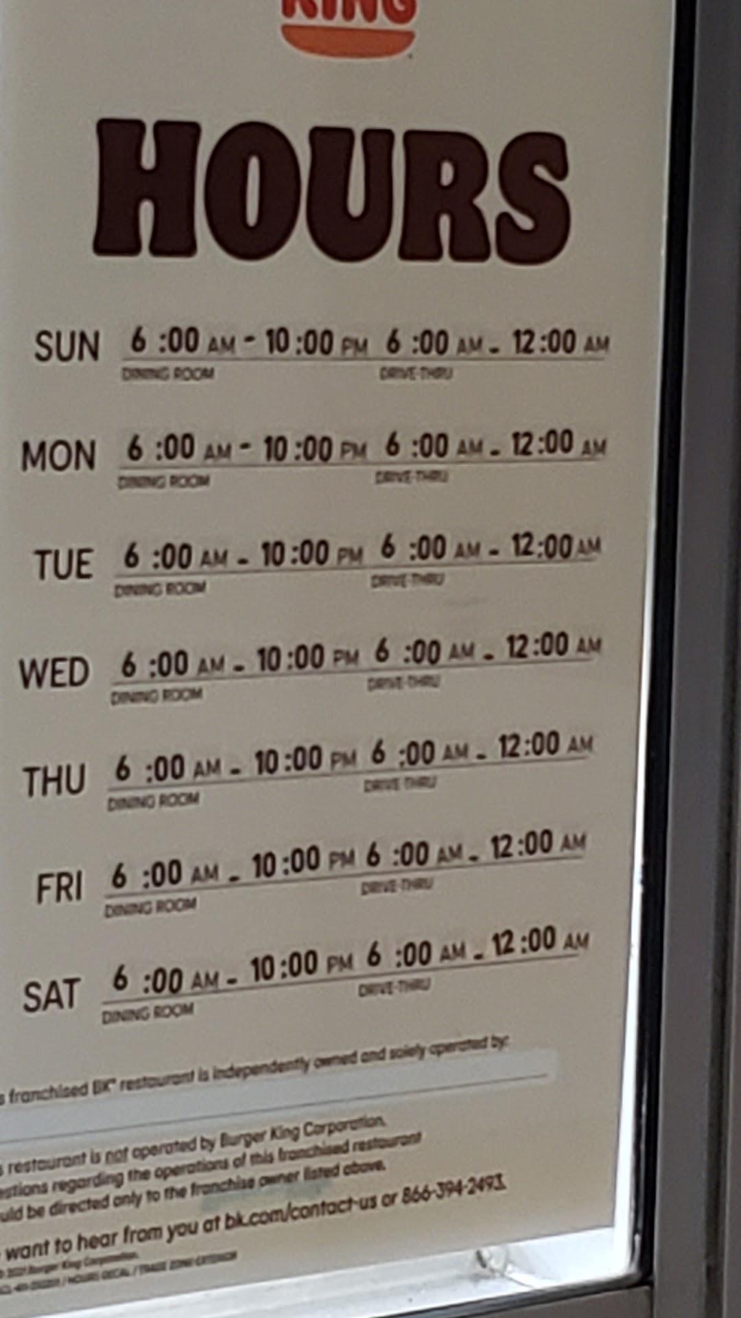 Read moreDined in...no one there to greet me. Guy who was outdoors smoking came in employee door and grabbed bathroom door saw me and entered cashier area. Placed my order still no other employees in sight. No receipt. Poured my drink then 2 employees showed and began putting order together wrong and cold . Wrong double burger no lettuce or tomato and not even lukewarm burgers threw it out....jalapeno bites cold solid cheese threw them out onion rings ice cold threw them out chicken fries lukewarm ate 3 threw out. Asked for onion ring sauce when order was bagged not good at Spanish but understood after asking 2x they had none asked for ranch I could see them in drive thru sauce holder had to tell him green one. During finding out food cold shared dining room with 2 families floor wet dirty tables I hear the F word 3 times and loud and clear both families turned looking at counter but didn't stop them from continuing their yelling and swearing....so watching that not one item of my food was cooked brought food back to show them...no one in sight .I dropped all the food into the trash and left. Stopped at a friend's after and he told me this Burger King is the worst and he works for the city....I thought the Milford NH one was bad this one is worse.......and with no receipt I had no vehicle to reach out to franchisee. So take this as a PSA avoid...