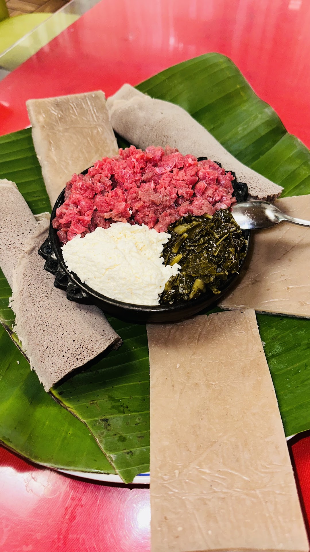The location is not very pleasing. Drunk men were sitting outside everywhere!! The food was subpar. My wife believed the food was reheated from the previous day. We went there for my stepdaughter's early birthday celebration (Nov. 11, 2023). When we arrived, our table was not clean, so my wife and I wiped it off. Also, the restroom wasn't tidy either. My daughter saw a giant spider in a web and ran out. The service was horrible. It seemed like they were getting food ready to deliver to some big function and pretty much ignored us. We finally received menus to order and then took a long time to receive our food; I believe it was due to getting someone's big order ready. Our drinks were in bottles, and my Diet Coke was way outdated and expired. The lady there preparing food and other orders would never check on us. After waiting a while, I went up to the counter to ask for more injera bread that my wife wanted; the lady thought I was getting ready to check out, but I told her no, I just wanted injera bread. So, she finally brought a little blue basket of it to our table, and she used her BARE HANDS right in front of us and threw it on top of our platter of food!! We were horrified after that, and we just got ready to checkout!!!!! We always leave a tip of appreciation, which is always more than the total ticket percentage... Needless to say, I paid for only the ticket amount!!!!!