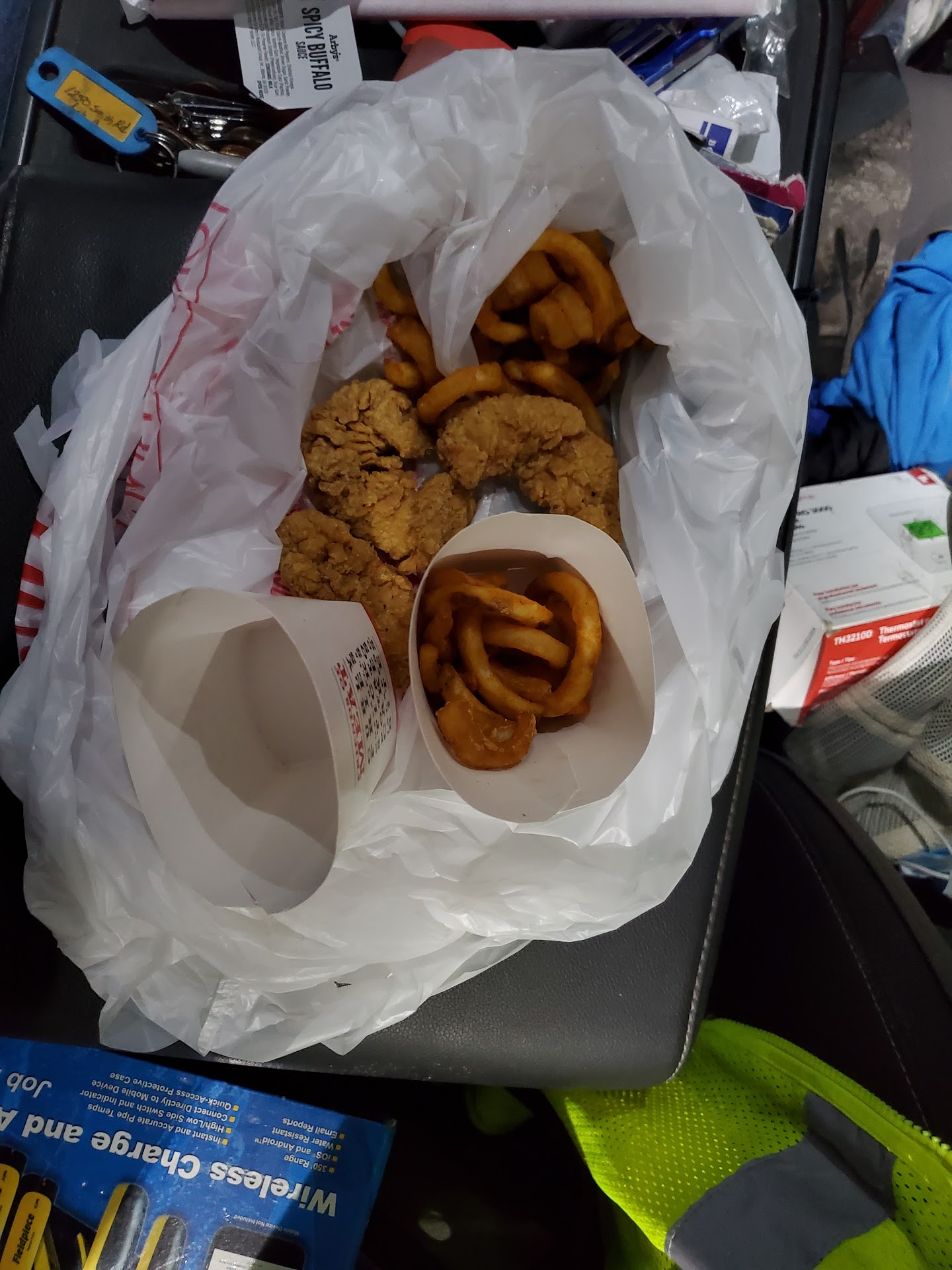 I went thru the drive thru and ordered the chicken strip (3 piece meal) was told it would be a 5 minute wait which I agreed to, and asked for a coke with no ice. Pulled around with 2 vehicles in front of me. Not sure how long it was till I got to the window but estimated 5-6 minutes. The employee didn't greet me or open the window, this was for almost 4 minutes before the window was opened and told the total for my food. Handed the employee the cash and they slowly made the change. I was then given my 3 pieces of chicken and small fry in a large t-shirt bag (Arby's plastic sack) but only about 1/3 of the fries were still in the box, the chicken didn't survive, they were in the bottom of the bag with the other fries, then I was handed my coke which was 2/3 full to which I asked if they could please fill the cup up, which they did. I then asked for some Buffalo sauce for there were none in the bag. I then pulled to the other side of the building to park and ear in the parking lot. The fries were Luke warm, the bottom of the bag was greasy and the chicken I was to have to wait for were room temperature at best and were tough and tasted as though they had been there for a while.