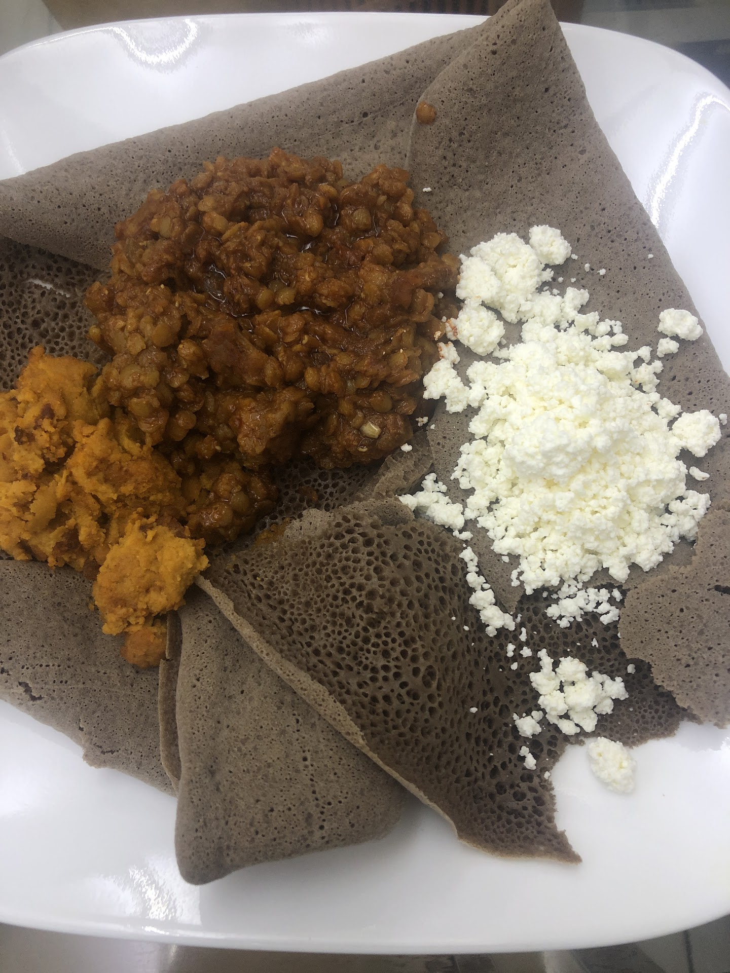 We're slowly exploring every Ethiopian restaurant in the area. This spot has the best meat curry we've had so far. The meat is not too tough, with medium spiciness, and seasoned perfectly. The vegetable sides are all yummy and flavorful- today she brought delicious lentils, green beans, a cabbage dish?, cooked greens, cheese crumbles, boiled eggs, and centered with the wonderful curry. She'll ask if you eat meat or are vegetarian, then will bring a selection of the dishes she has prepared. This was the 1st place we saw crumbled soft cheese that looks like feta, but is sweeter and milder, and boiled eggs for each person. If you've never had Ethiopian food, you eat it by hand, using pieces of a crepe/pancake form of gluten-free bread, called injera, to scoop up bites of food. The food is served on a platter of the injera bread, and your party all eat off the platter family style. It's different, but our family is loving exploring each restaurant and the nuances of each chef's cooking. This chef is very welcoming and gracious. She handled everything herself, with impeccable hospitality. The prices are reasonable; for 3 people, 3 drinks (the hot spiced tea is great) + tax, or...