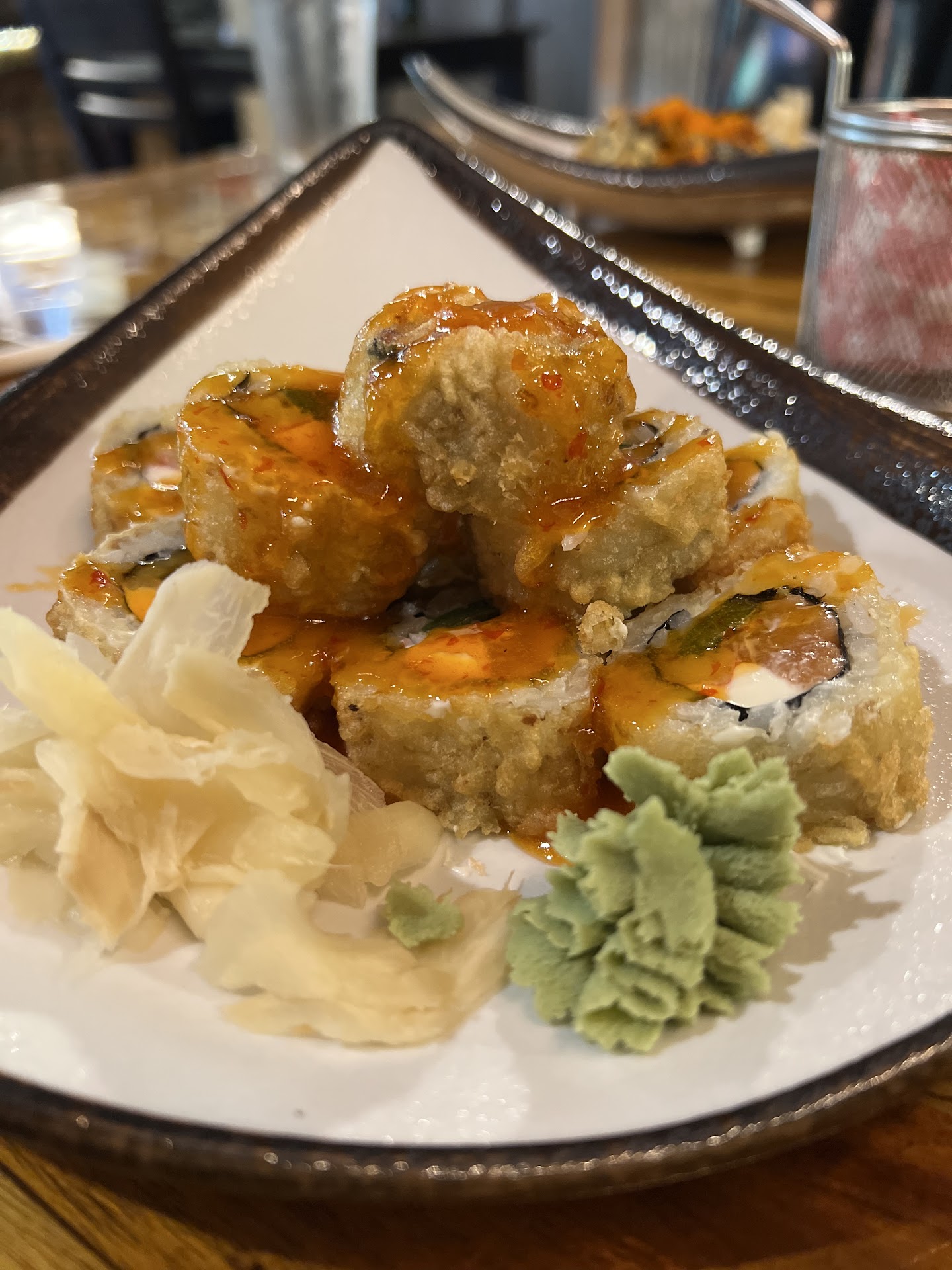 The sushi selection is equally impressive, with each roll sounding more tempting than the last. My personal favorite? The Long Hunter Roll â a symphony of salmon, crab, jalapeño, and cream cheese, all deep-fried to perfection and drizzled with sweet chili sauce.