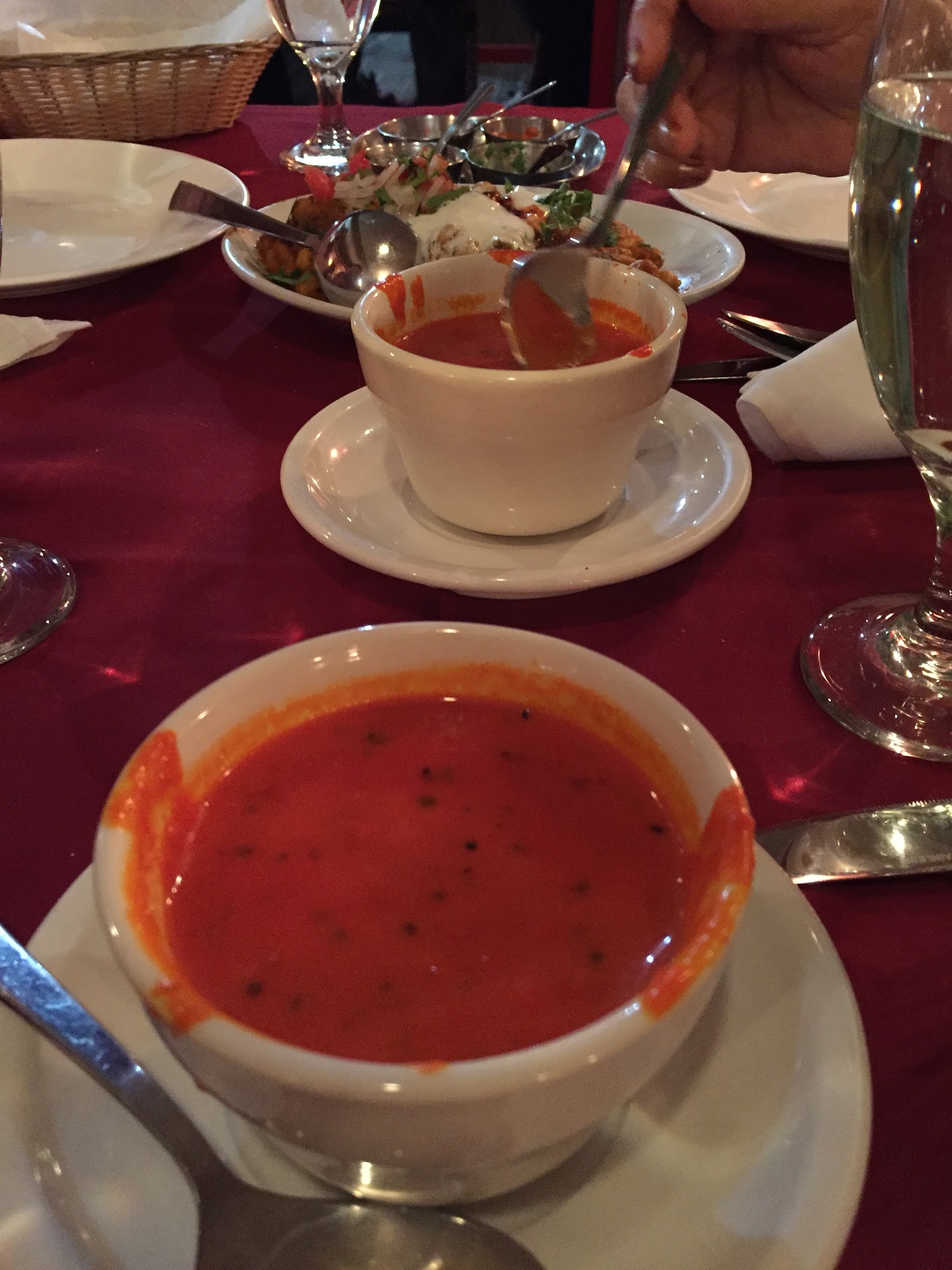 This Indian place is located in a complex opposite to Vanderbilt University, so you could see the college crowd in this restaurant. I was visiting Nashville over the weekends with my family and I was looking for an Indian place to eat for Friday evening as we couldn't get a table at a restaurant recommended by one of my friends. The place was jam packed and somehow the servers managed to provide us a table. The kitchen seemed to be busy with additional online food orders as well. For starters I ordered Samosa Chat and Tomato Soup. For the main course, we ordered 3 dishes - Dal Makhani, Paneer Makhani and Malai Kofta. In breads we ordered Garlic Naan and Lachha Paratha.