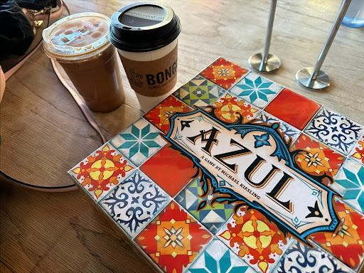Read moreCoffee, bagels, board games. What's not to like? They run excellent seasonal specials on coffee drinks, along with your standard espresso latte and cappuccino offerings. Service on these has always been very quick for me so this is a good spot to grab and go if you are in a hurry. If you are not feeling that they also offer some kamboucha chai tea and green or black teas. If you are here for the varied selection of board games you may also prefer one of the rotating beers on tap. Speaking of board games they offer a curated shelf of classics like Monopoly, Battleship and Scrabble along with tons of modern board organized by type and level of difficulty. Seating is pretty ample but because of folks playing longer games it can get crowded. If two of you are at a larger table expect people to ask to sit with you. To be honest if you want to sit and drink coffee or mess around solo on your laptop I'd strongly recommend a different location. This place is the definition of "Good for Groups" If you need food they offer several bagel sandwiches and a few panini style. I'm a particular fan of the Greatfull Bomb and The Adult Grilled Cheese. Both come with a sun-dried tomato cream cheese that is tangy with a deeper umani hit than plain cream cheese. Also there is no patio per se but there are a few chairs right out the door you can grab to enjoy your boardgames and coffee...