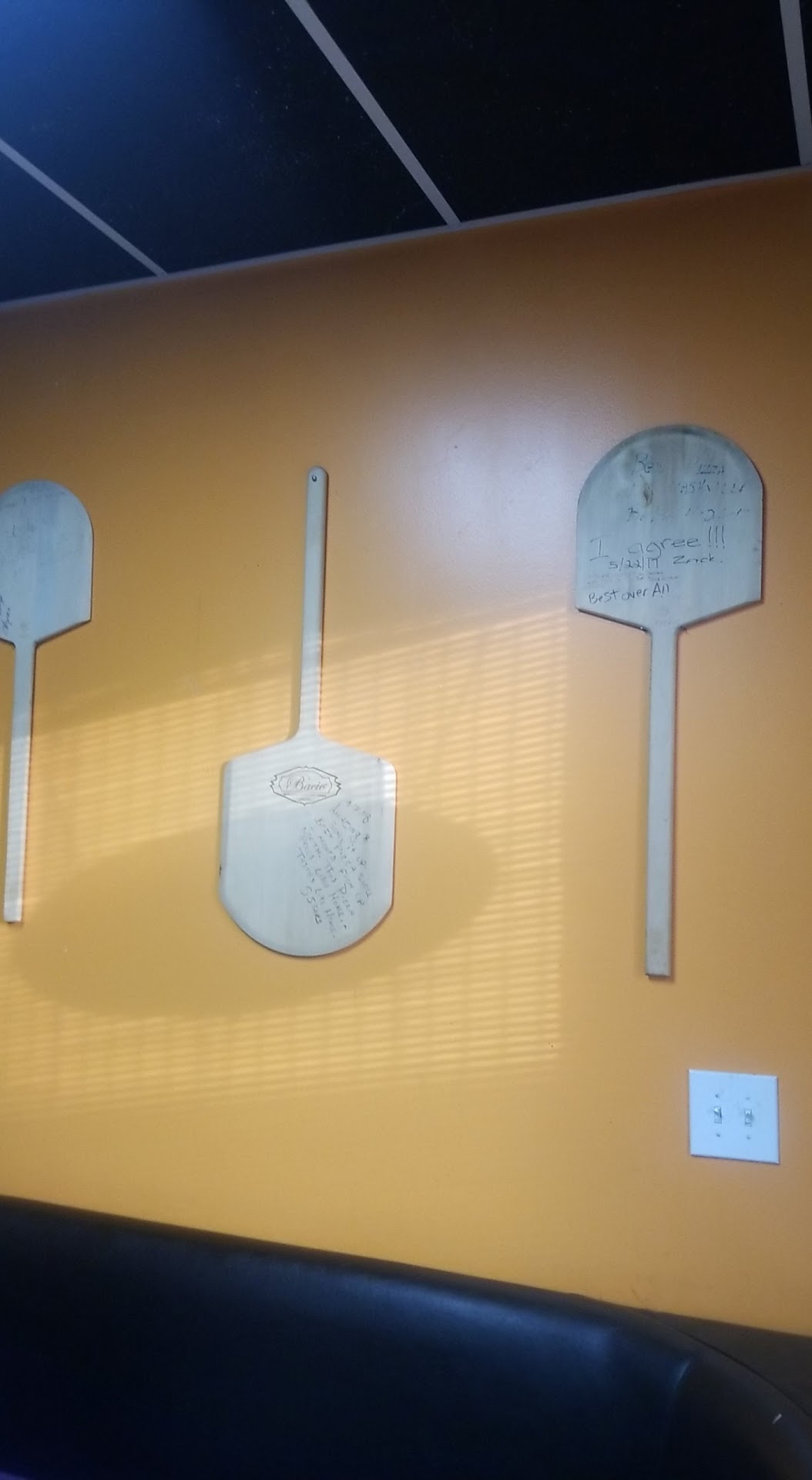 Walking in you'll see pretty standard decor of a pizzeria In Nashville. Neon signs, plastic fake brick, some pizza paddles on the wall, and a single New York skyline portrait.