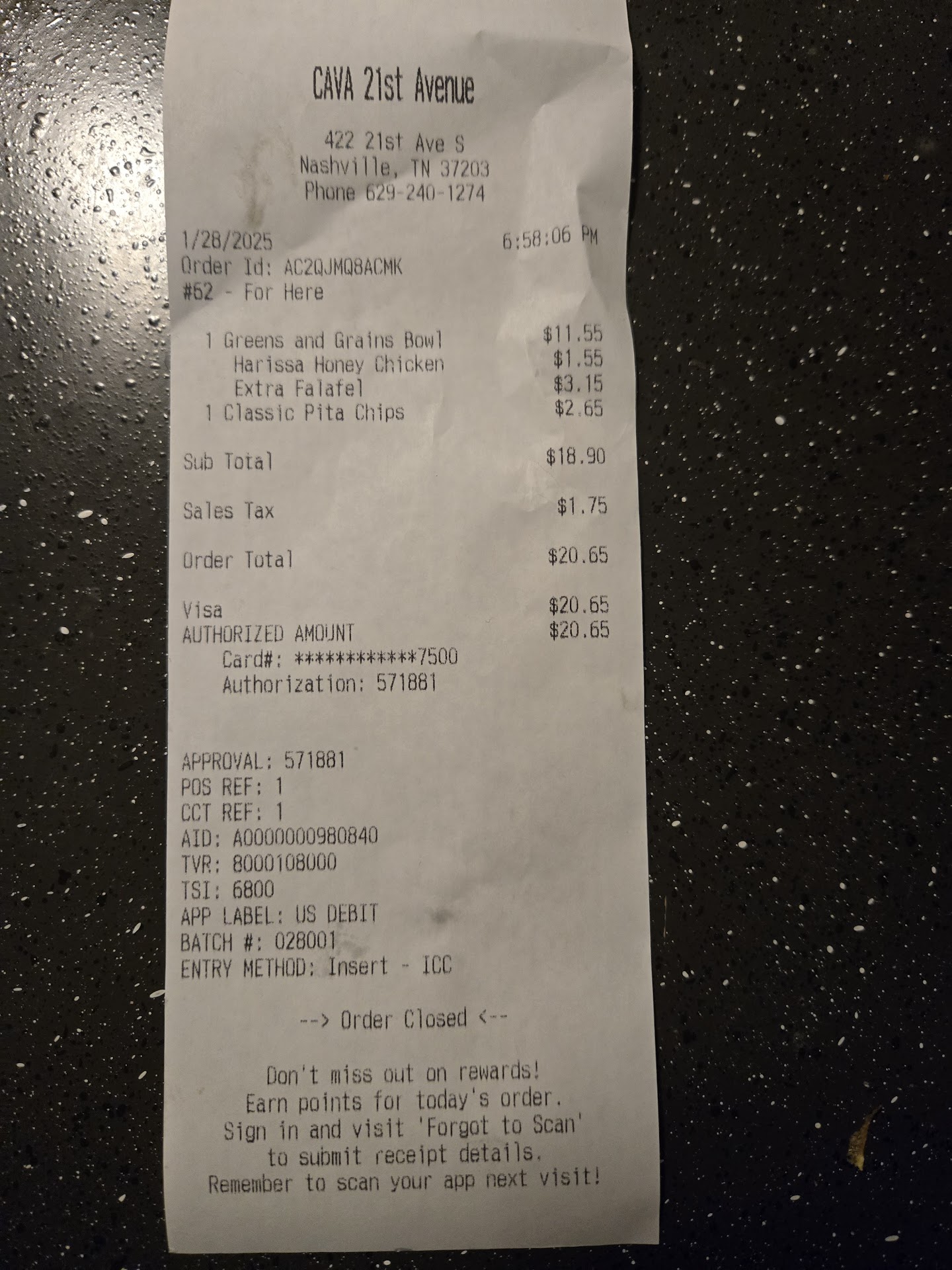 Updating my review (for original review see below). I have been to this Cava many times. It is the most convenient to us, hence why we keep coming back. I have a lot of dietary restrictions and Cava is one of my very few safe places. Unfortunately, each time we visit this location, there’s an issue. Usually charged for things we ended up not getting or able to consume.