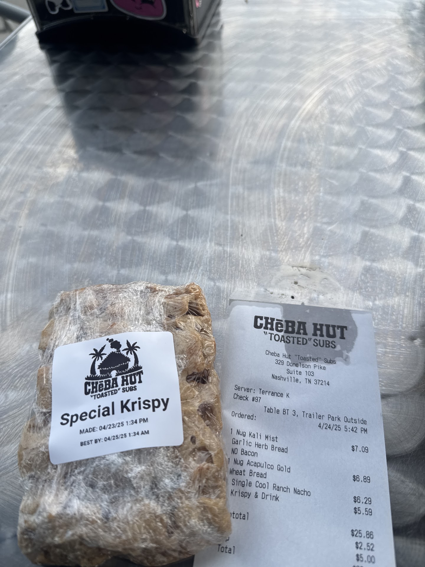 Read moreMy first experience andddddd I would totally come back! I didn’t know about this place until I saw the $25 for $50 discount gift cards on Nashville’s best deals. Doing my research I immediately saw the great reviews and I had to come try. I thought it’d be THC infused options but it’s really just THC inspired lol. Upon arrival, the parking is actually on the side of the store instead of in front so you have to walk the sidewalk to the restaurant. The place was smaller than I expected, but there’s a sandwich assembly line right in front and the bar/tables on the side. Very cool atmosphere and decor. I decided to order at the bar and sit outside on a beautiful day. Terrance at the bar is super cute, sweet and buff 😆 he took great care of me! He gave great recommendations. I got 2 nugs (prices not on the menu, I thought that was interesting) Kali Mist and the Acapulco gold- both really good! And also the cool ranch Doritos 😎 idk why I thought they had fries but they don’t and that’s okay. They have a cinnamon toast crunch rice Krispy treat here and I’ve yet to eat it bc I’m so full but it looks yummy! The koolaid is nice and sweet- I tried them all 🤣Overall great experience and good price value! 2 nugs, nachos, rice krispy treat and drink for $25...