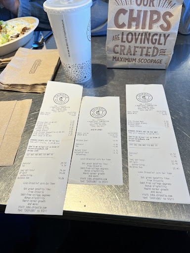 Read moreMy girlfriend ordered a simple bowl, chips, and guacamole. We got it delivered around 10pm. They missed basically everything on the bowl other than chicken, lettuce, and rice, didn’t have the guac or the chips either. I went up there pretty irritated because obviously we paid for something so I kinda expected the bare minimum, and we got MUCH less than that. When I went in at roughly 10:20 the chairs are all put up, the hot line is completely broken down, and the staff is standing around doing literally nothing. One dude comes up to ask what the problem is and I inform him of my issue. He lets me know that apparently they’re out of guacamole. After another person remakes the bowl in a clearly frustrated way I go to leave, but before I do I check the bag. No chips, and the bowl is suspiciously light. I ask about chips, to which he replies “it’s Sunday man we’re out of stuff now.” Finally his manager just says “give em some kid chips.” So I finally leave and make it home only to find that the bowl is basically once again totally wrong. The second bowl actually had less than the first one somehow. Look, I know the struggle of working in food service, I’ve done it myself for years. But all my girlfriend wanted was some chipotle on a Sunday night delivered so we could hangout on the couch and watch TV. Instead, I’m making this stupid review about a place that I absolutely hate now. The staff sucks, the food is below average, and we should’ve gotten a refund. I get that it’s just food, but all we wanted was something to eat, and to relax on a Sunday together. DO BETTER. This...