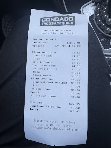 Ā Ā Ā Read moreAvoid this place at all cost unless you like having disappointing food and a way lighter wallet. You will not be paying for a good meal rather the āambienceā and the fancy artwork on the walls! And whatever you do⦠DO NOT choose the build your own options as they charge for basic items on top of the $4.55 base charge. Even though you will already be paying an up charge of $1.25 just for adding meat. I ordered three tacos. One brisket, one shrimp and one steak. The shrimp was so mushy that I could not distinguish when I was eating it versus eating the rice and beans. The steak was way over seasoned. It was so salty and the brisket was unmemorable. I could not finish any of the meal and basically asked for my check with 3 half eaten tacos. Much to my dismay when I got my ticket I had been charged $30 for THREE of the most mediocre tacos youāll ever have in your life and a Pepsi! Add in a tip and I paid just under $36. I told the manager on duty that I feel like I had been in a knocked smooth over the head in a highway robbery! She offered to give me coupons for a free taco in the future, but I decline because I will never ever be back. Save yourself and your wallet just go a few blocks down to West Coast Taco or instead! Youāll pay half this cost for way better food!