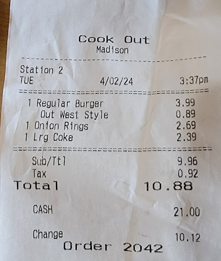 Read moreI recently had an extremely disappointing experience at Cook Out, and I feel compelled to share my negative feedback. I would rate it just 1 star out of 5, and here's why: