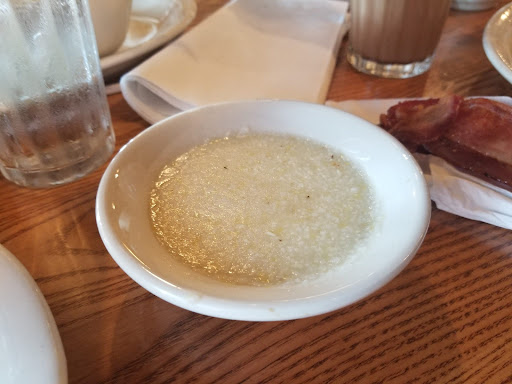 It then took 15 minutes for anyone to visit our table for the first time. Then another 20 to receive our drinks and food. The grits were runny, watery and bland. The biscuits were under cooked and doughy. The sawmill gravy was flavorless save for an overwhelming amount of pepper. My "scrambled" eggs were a flat, firm patty (looked more like an omelette with nothing in it). My hash brown casserole was rubbery and stale, as if it had sat under a heat lamp for too long and then allowed to cool.