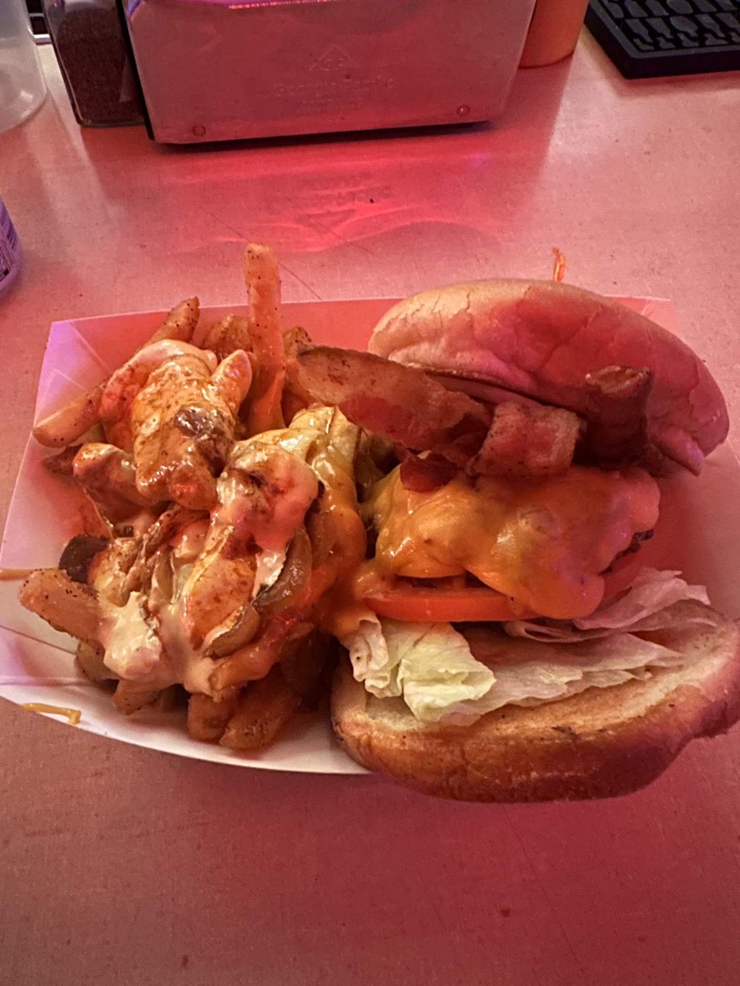 AMBIENCE. Divey AF, and I mean this in the best of ways. It's a hole-in-the-wall burger joint on Gallatin. Expect a super lively atmosphere with lots of eating and drinking! The outdoor patio offers picnic table style seating that looks awesome but it was too cold to sit there when I was there, unfortunately.