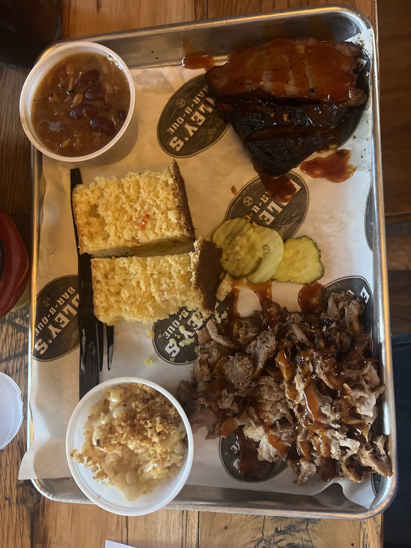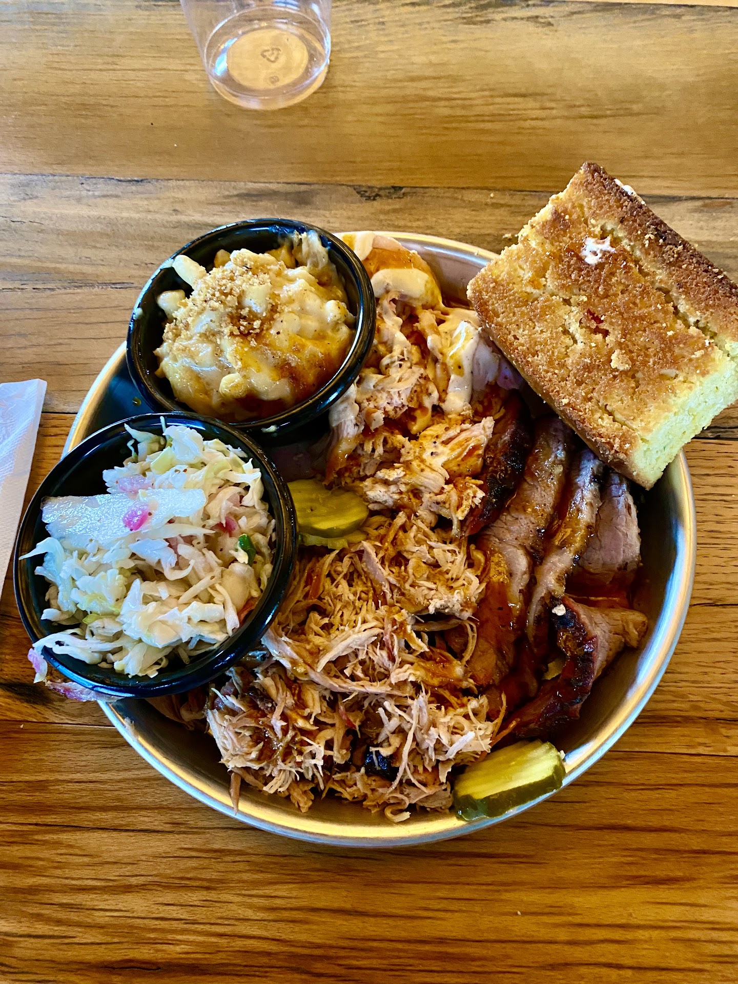 Overall the food was good with the chicken taking the “Best in Platter” honors for tenderness and flavor, PLUS the red & white BBQ sauce was incredible. The brisket…very tender, nice light smoke, and good bark texture. The pulled pork was good, but lacked the flavor you look for with pulled pork unless you drown it in BBQ sauce. For sides I did the Cole Slaw and Mac & Cheese. I’m not a huge fan of vinegar based slaws but this one is an exception with a delicious sweet vinegar marinade and red onions…seriously good slaw. The Mac & Cheese was good and the bread crumb topping was a nice touch. The cornbread was a little dry, but I’m sure it would have been much better had it not been dry. Overall good BBQ with great flavors but it seems this place is mostly “Do it Yourself” because other than the person who delivered the food to my table, no one checks on you and I basically had to...