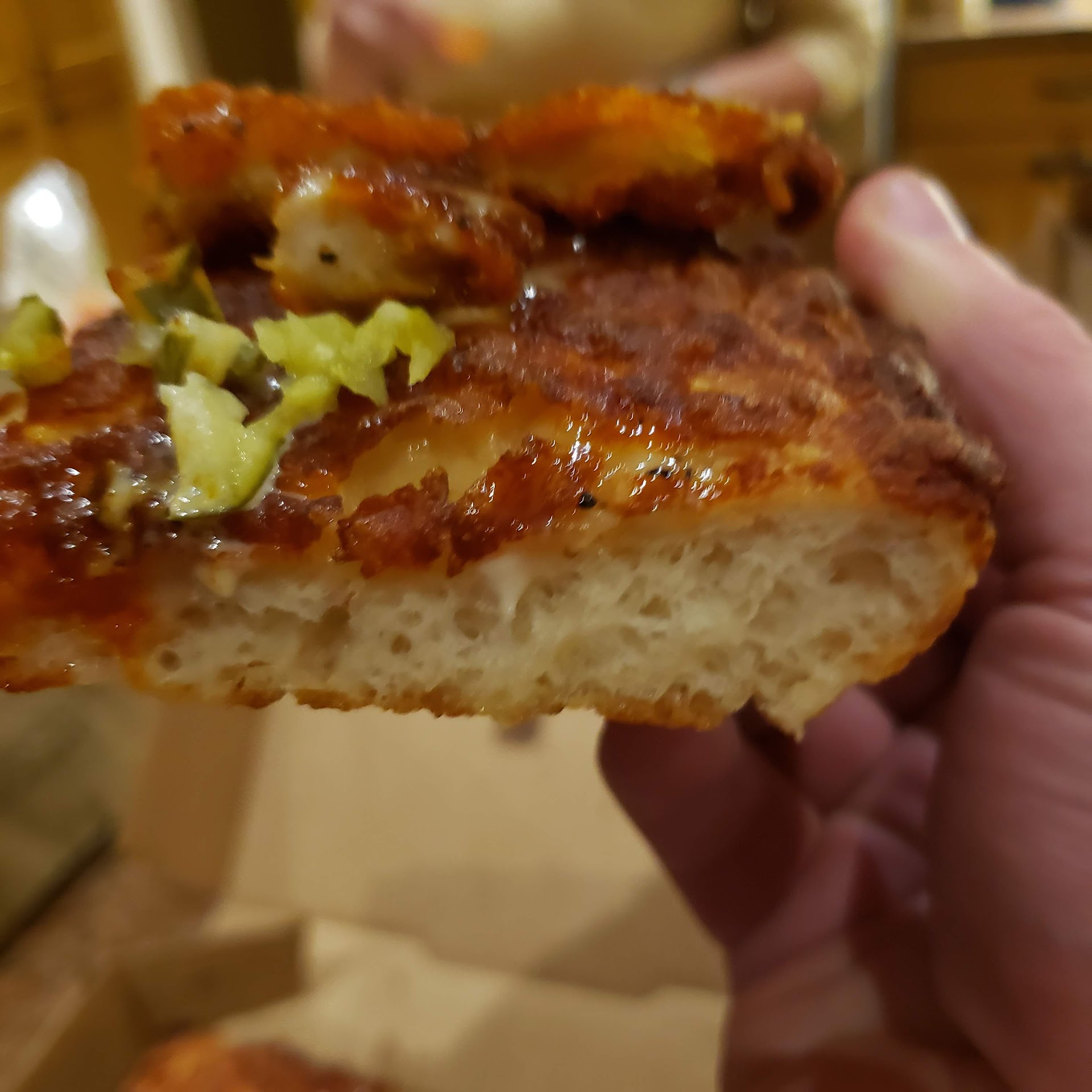 Fast forward to second pizza , the bottom had a crispy crust which IS appropriate for Detroit style pizza we were looking forward but the dough between was STILL raw.