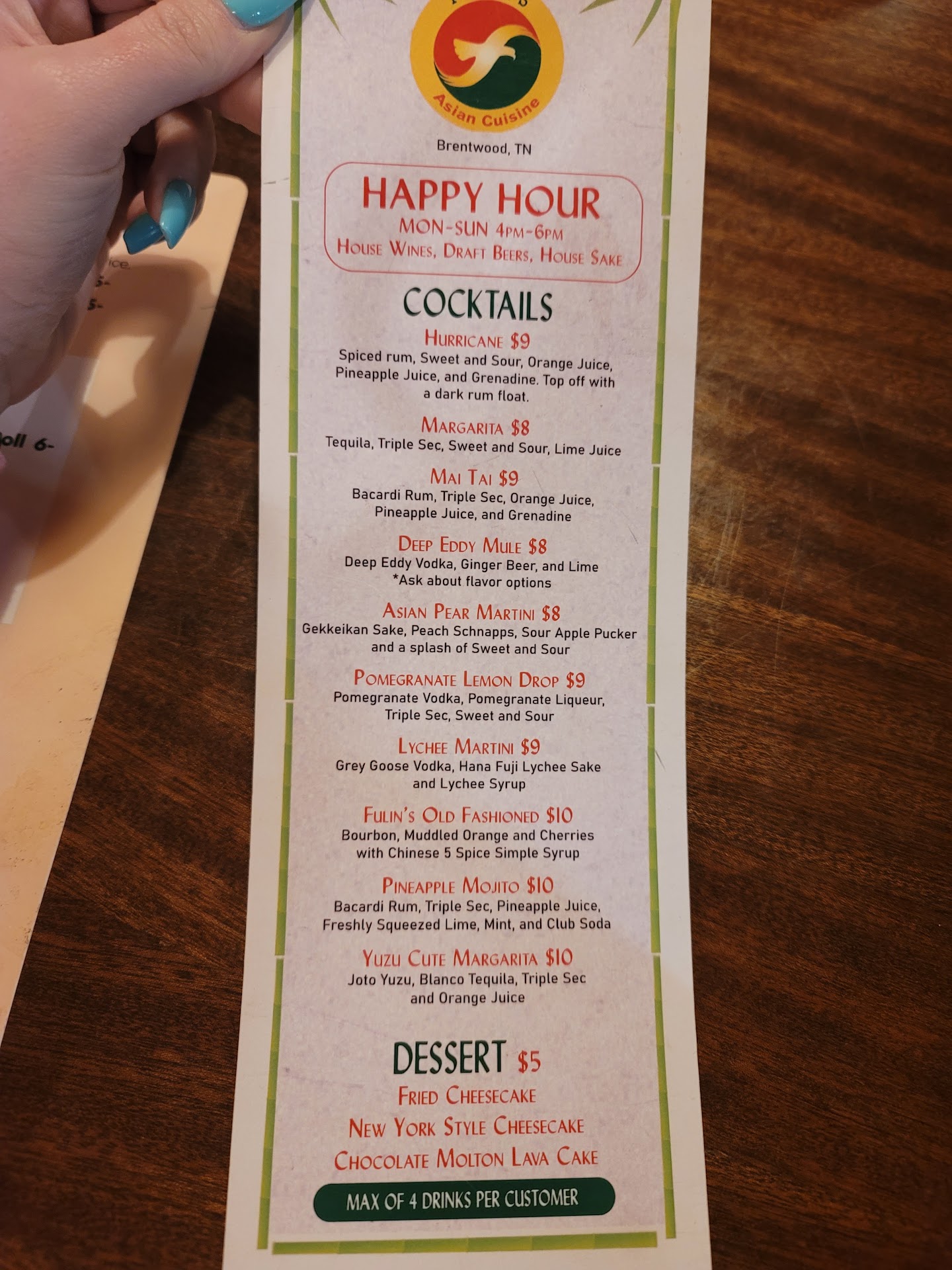 I only wish I could rate this zero stars or less than zero. Just had one of the worst dining experiences of my considerable lifetime. We had intended to use a coupon from the coupon booklet we purchased from our grandson. I guess I should have known better if an established restaurant is still resorting to these types of coupons to drive business. In any case it was a Saturday night and the restaurant and bar were both lightly busy. The coupon said it could not be used with any other offers or discounts - a fairly common restriction. Our server was a young Asian woman whose spoken English was ok but her full understanding was somewhat limited. After verifying that our coupon was "in date" she proceeded to tell us that happy hour was until 7:00pm. My wife and I ended up ordering 2 individual rounds of well drinks which the menu indicated were part of happy hour. We ordered 2 entrees with mine being a combo of shrimp & scallops which was not listed on the menu but according to our server could be ordered for an extra dollar over the cost of the shrimp alone. I also ordered hot and sour soup - it turned out to be mostly spicy hot without much flavor otherwise. My wife's beef dish was over done and not very good. My shrimp and scallops were very good. When it came time for the bill, another woman who identified herself as the manager came to our table and explained that we could not have both a happy hour discount on liquor and a coupon discount on our meals as this constituted 2 discounts. We told her the server had not pointed this out despite our presenting our coupon at the time we ordered. She was not persuaded. I pointed out that we could have gone to the bar, had our drinks, closed out our tab, and proceeded to go to the restaurant and ordered dinner with our coupon - she was unpersuaded. She told us she was unable to make any changes to our bill as the computer system was in complete control of the restaurant. I then made the observation to her that it did not appear that as a manager she had any authority to do anything - she essentially agreed with me. I then asked her who the owner of Fulins was and she refused to tell me. By this time I had already decided that Hell would freeze over prior to my next visit to Fulins and I informed her that we would take the happy hour discount as it was slightly better than the coupon. She proceed to ask if we were ok with that and we responded that we were not but it appeared that that was the best we were going to be able to do. Subsequently the server brought us the bill. They had in fact removed 2 of the 4 drinks from our bill, but they had charged us for drink doubles - something that was never requested or discussed with our server. They had also charged us a $4 upcharge for my scallops - I believe that worked our to a dollar a piece. The server returned to the table and we immediately requested the manager. The manager was a little more agreeable this time and took off the double drink upcharges and reduced the dinner upcharge to the stated $1. I was in the process of finalizing the credit card receipt when the server returned to the table to argue with my wife and I that she had told me that my dinner upcharge would be "dollars"(plural - her explanation), not dollar, singular. I pointed out to her that most people who ask want to know a little more specifically than "dollars" . We told her she needed to improve her command of English and to own her mistakes - she continued to argue that she did not make a mistake. Although I did in fact leave a tip, I adjusted it commensurate with the servers final interaction with us. I will never be returning to this restaurant. If you are reading this review and decide to patronize Fulins anyway, I would recommend getting a written, signed contract from the manager prior to ordering lest you encounter the same frustration...