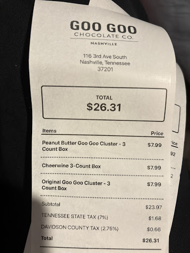 I came in because I heard Goo Goo clusters were a Nashville specialty and personally I had never tried them before and I was asking the store manager for some more information about them. When asking her about the size of the goo goo clusters, she wouldnât give me a straight answer and I had to use my hands several types in a shape in order for her to tell me how big they were. Later on, when I was asking if there were samples to try because I had never had them before, there was this very nice employee who had glasses who kindly explained to me they didnât have any goo goo cluster samples available but had some ruby chocolate available for me to try, which I appreciated. She was also very helpful in letting me know that the original goo goo clusters are the most popular. My biggest issue is that this store doesnât honor the promotions they list. There was a sign that said that if you buy a 3 count original flavor, peanut butter and cheerwine there would be a 10% discount. That was not given. I saw a sign that said that if you spend over $50 you would get a free thermal tote bag. Keep in mind this day it was 4pm and 88 degrees Fahrenheit. The store manager(black female) was checking out my order, which was over $70. I had asked her if I should worry about the chocolates melting because I was planning on bringing them when I fly back to Chicago which she said no. After the exchange, she didnât give me the tote bag. Iâm really disappointed that the manager, who should be intimately familiar with the promotion and my comments on the weather which hinted at the thermal tote bag did not register in her mind to give me the tote bag. I hope next time they honor the promotions they have at the store. I will not be coming back to the in person store unless they make a commitment to honor their promotions clearly listed and visible...