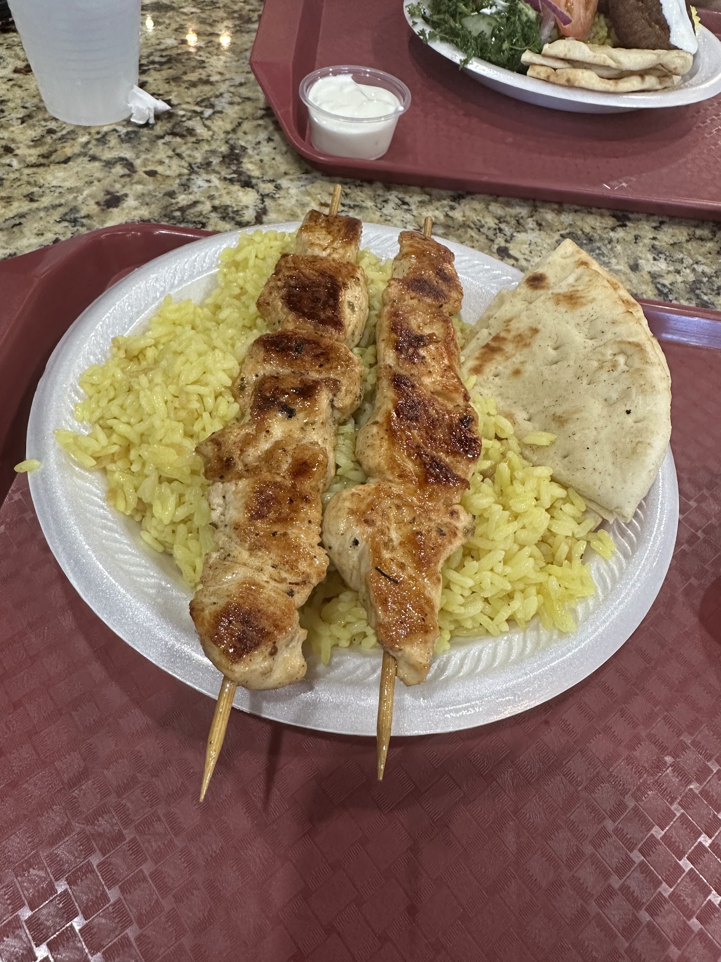 Food I ordered the chicken kabob with rice and pita bread, and it was fantastic. The chicken was perfectly grilled—juicy, tender, and seasoned to perfection. The rice was flavorful, complementing the chicken nicely, and the pita bread was soft and fresh. The portion size was just right, leaving me satisfied without feeling overly full.