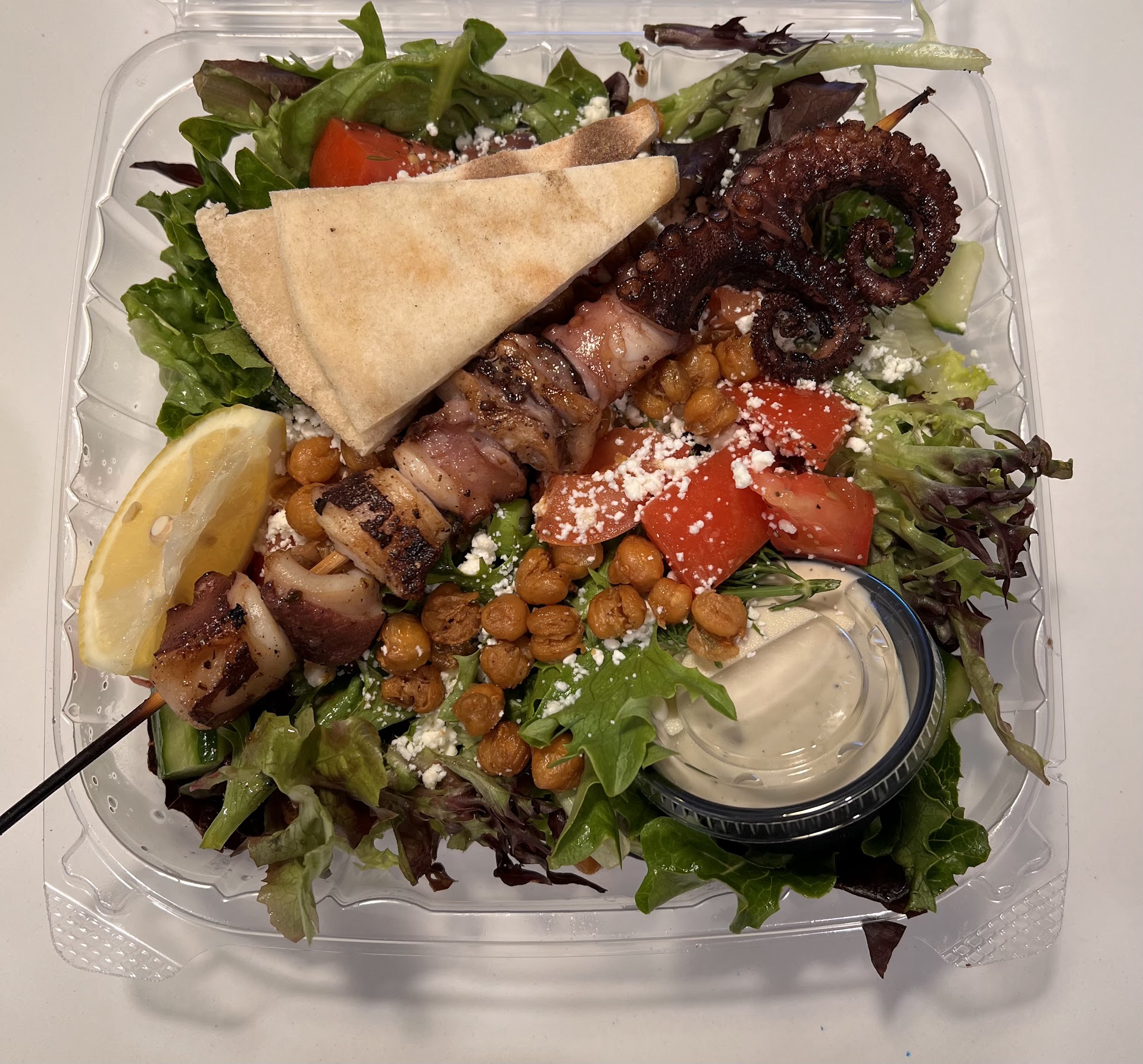 Greko Salad:If you're in the mood for a lighter option that still bursts with Mediterranean goodness, the Greko Salad is a great choice. It's a vibrant medley of mixed greens, juicy tomatoes, Greek feta cheese, Kalamata olives, crispy chickpeas, zesty green onions, refreshing cucumber, and grilled pita. The crown jewel of this salad is the creamy Greko dressing, a luscious blend of flavors that perfectly balances the ingredients. To make it a more substantial meal, we added live fire Greek rotisserie Springer Mountain Farms hand-pulled chicken. Every component of this salad was incredibly fresh, contributing to the overall quality of the dish.