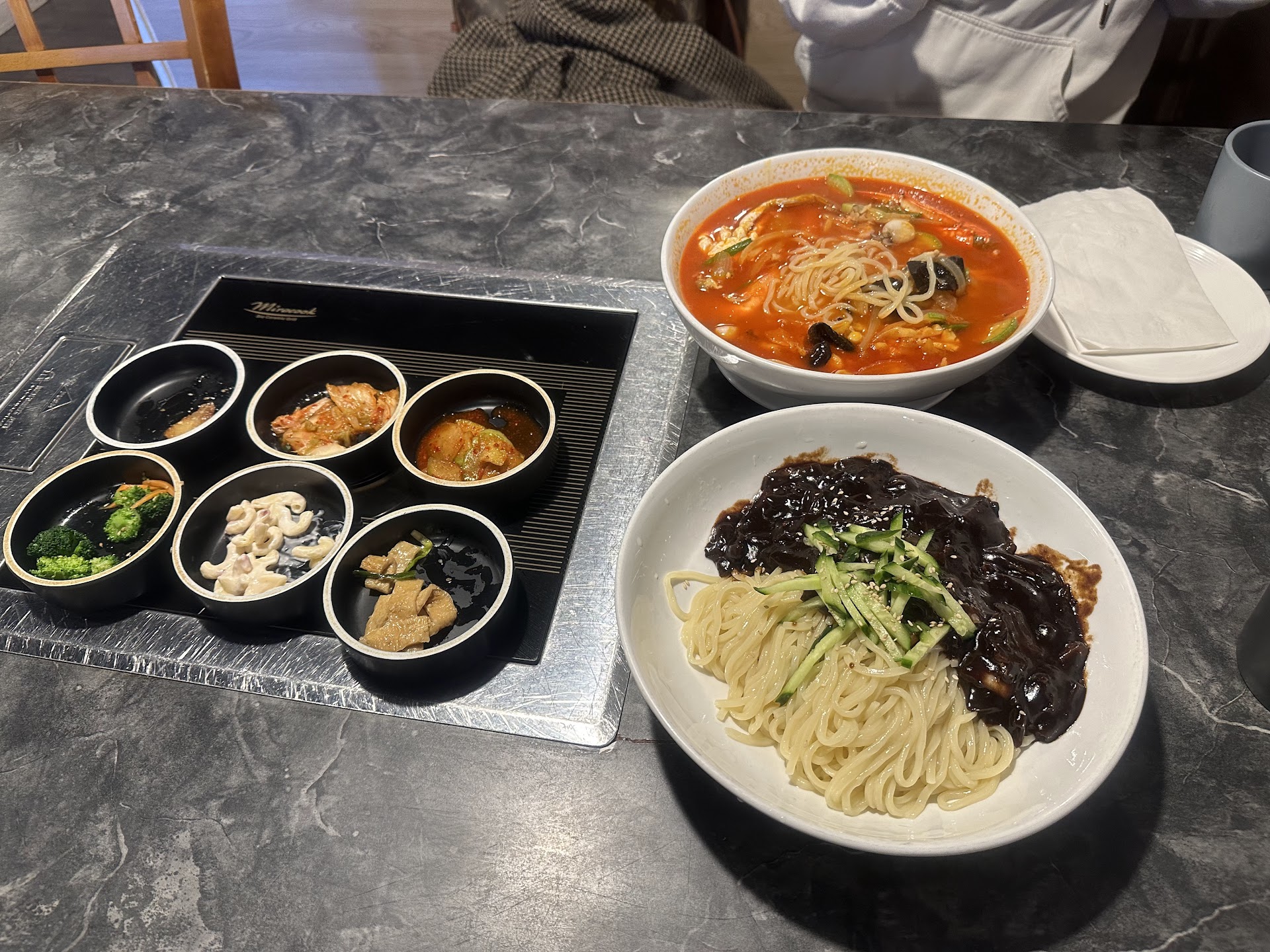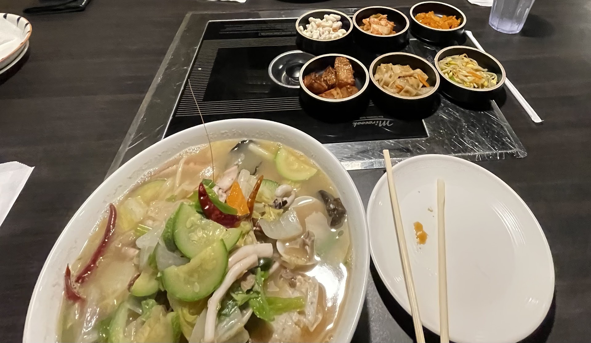 Our orders were taken(kinda asking for orders three times within 10 minutes), I ordered white jjampong(sea food) and my gf ordered white rice with stir fried veggies and black bean sauce(she is pescatarian). 10 minutes later another employee came and told us her choice of food is sold out. So we have to order another item! She got the menu again and ordered Japchae(a noodle item). After 10-15 minutes our food arrived. And while I was trying to understand how to eat squid and octopus tentacles!, my gf found out that Japchae had beef in it(not even mentioned in the menu) and she ate some of it mistakenly. We had to call them and this dude came. Me: This item has beef and the menu didn’t mention it. Dude: oh why you don’t eat beef? Me and my gf: No. I am vegetarian(to avoid more dietary confusion) Dude: oh so you are vegan… (then he looked at me) so you can eat this? Me: no sorry, I don’t eat beef either. Dude:(now looking surprisingly at my sea food soup) why! Me and my gf: no he doesn’t eat beef. Dude: why… beef is delicious(grinning weirdly) Me: …. Then he begrudgingly took her meal and brought a stir fried veggie with rice that she had to order finally. I was finding the seafood soup hard to eat so I gave myself and them another chance by asking him, “Could you give me a sauce like bbq or bulgogi sauce?” Dude: oh… you mean sriracha? Me and my gf pointing at the dumpling sauce we had: this one maybe to spice up the soup a bit. Dude: oh I think, sriracha would be best with this. Me(reluctantly): ok if you say so. Thanks.