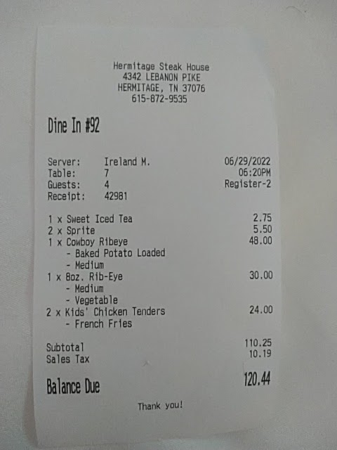 We do not mind paying for good food and good service. Our server was very pleasant and is partly why I am giving the restaurant 2 stars. The server was Ireland, she was very nice. The second reason I gave more than 1star is the salad bar. It is well above the average salad bar, very good!! Now to the issues. The steaks were a little pricey but the place was recommended by two people that I know. The server said they had a ribeye special so I ordered it. It turned out to be special because it's the most expensive steak they have, lol. When my beautiful bone in ribeye came out, I was pretty excited. It was accompanied by a delicious loaded baked potato. My wife ordered the $30 8oz ribeye. I have seen better looking steaks at the waffle house. The steak was cooked a true medium, reddish pink when I cut into it. First bite tasted delicious, but something was off. I thought I had a thin piece of grissel but I pulled a long black hair out of my mouth, about 4-5 inches long. I feel like it was on the plate under the steak. I was a little sickened by this. The server took it back and reluctantly I agreed to get a new steak. The lady who was the manager or owner came over to apologize and let me know everyone wears a hairnet. I said no big deal, things happen. They brought me a new steak meanwhile my wife was not able to choke down much of her $30 piece of old boot. It was so thin, they should decline to offer that size if they cannot cook it better. The owner/manager lady came to check on us and see how the new steak was. Me being me I said "it's a hair better than the first one". She chuckled and said I must have been sitting there thinking that up. This is where it really went down hill. While she was there, I told her about my wife's steak not being very good at all. She immediately looked annoyed and asked what was wrong. We told her it was tough and had no flavor. She said mine was better because it was on the bone and offered no apology for the poor steak and then walked away. My daughter was coming back from the restroom and passed her and the server at the beverage stand. My daughter said the lady was waving her arms and was telling the server that all I wanted to do was complain. I am not that person, I however want the food and service to match the price. If we wanted to complain we would have mentioned the soggy boiled brussel sprouts that were described as roasted by the server. My wife didn't eat very many of them. Later the server came out with a desert menu and asked if we wanted to pick one or two for our trouble. We were not looking for anything for free, however I don't believe I could charge those prices to someone who had been served a long piece of hair. We took the desserts mainly because my wife wasn't able to eat much of her food. I am going to try to post the receipt for reference. My daughter's each got a kids chicken tenders. It was the kind of tenders that are served at our local bowling alley $12 per order. If you go, I hope everything goes perfect. I would recommend spending your hard earned money somewhere else. At least a longhorn will make their mistakes right for...