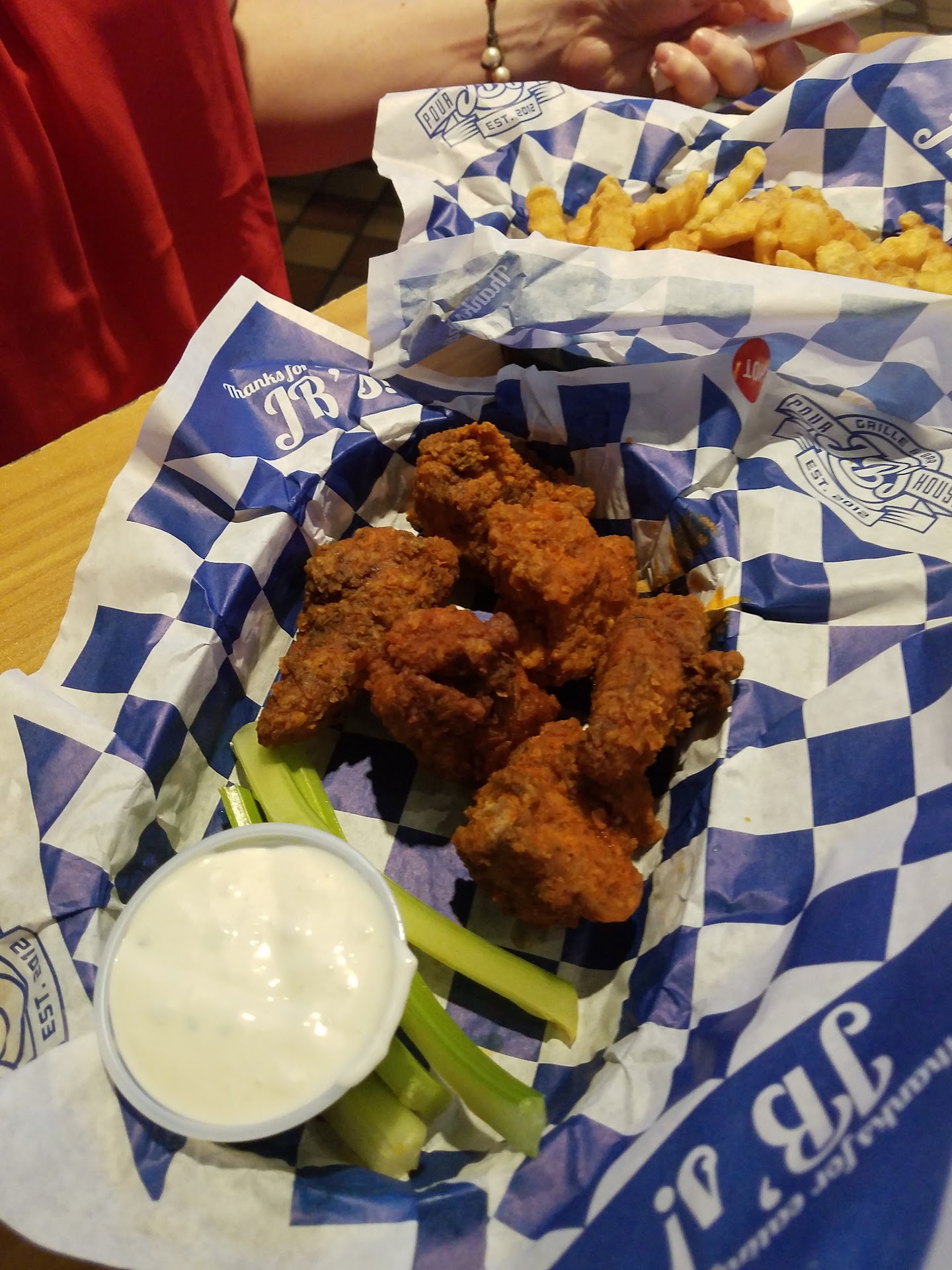The boneless wings were really good. Other places make boneless wings which are 90% breading and almost no chicken. These were really good chicken breast with just the right amount of breading. Good hot sauce which was not so hot as to overpower the chicken.