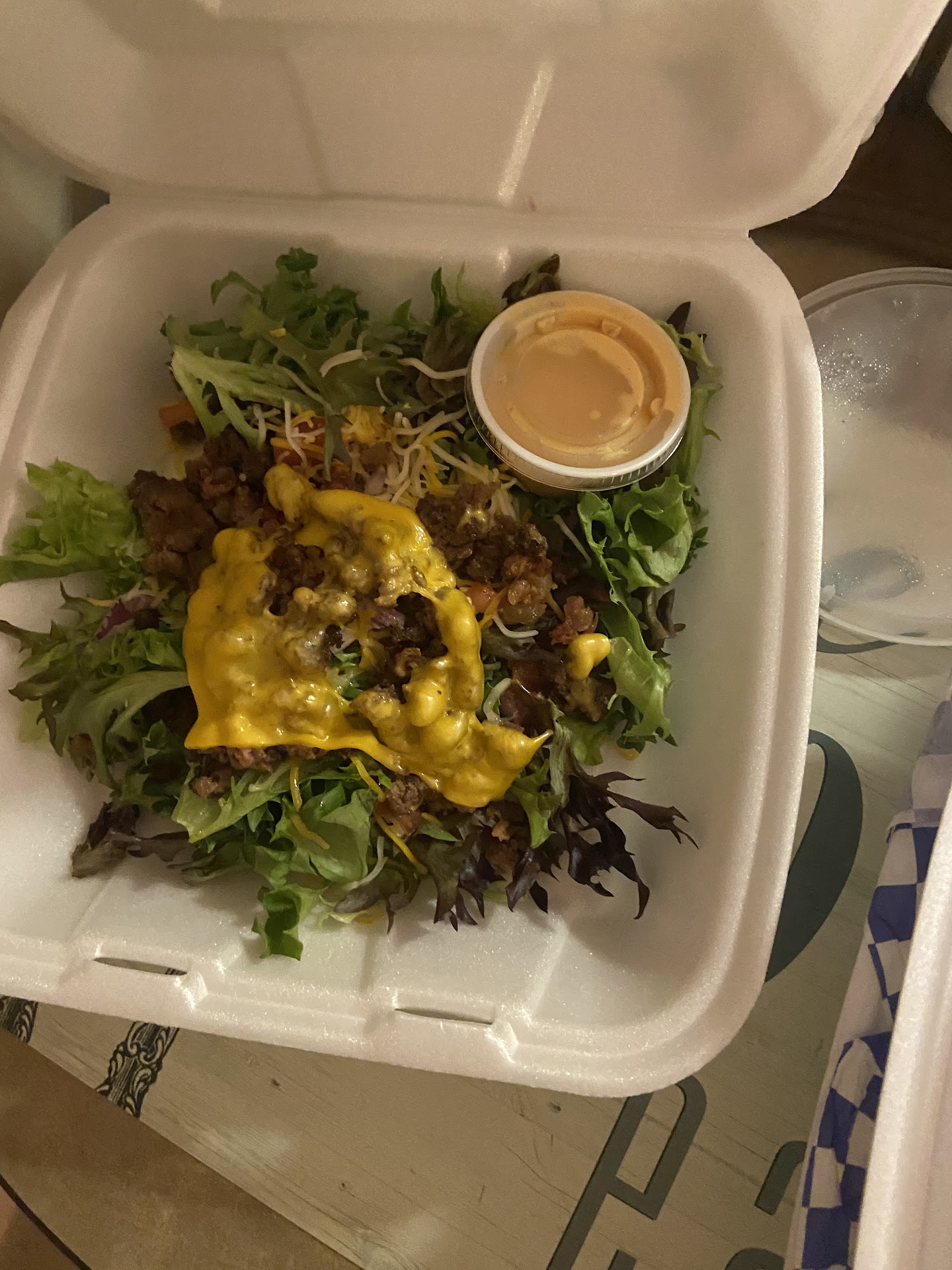 The food was OK. Felt like eating at your cousin's house, like they patted out a burger but the rest was frozen or premade storebought. Shredded lettuce on a burger is a sign of cut corners at a big chain like McDonald's, pretty wild to see it at a place like this. The burger also had a hint of seafood.