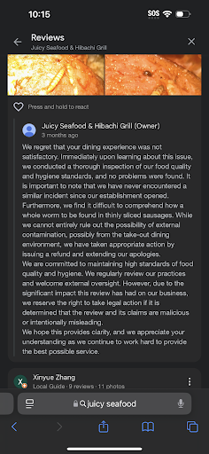 The Google review was honest and in no way misleading. I suggest this establishment use their funds for âlegal actionâ towards better health practices and ensuring excellent customer service. I do not feel bad for my review negatively impacting this business because you all chose to be in the food business where health should be prioritized first.
