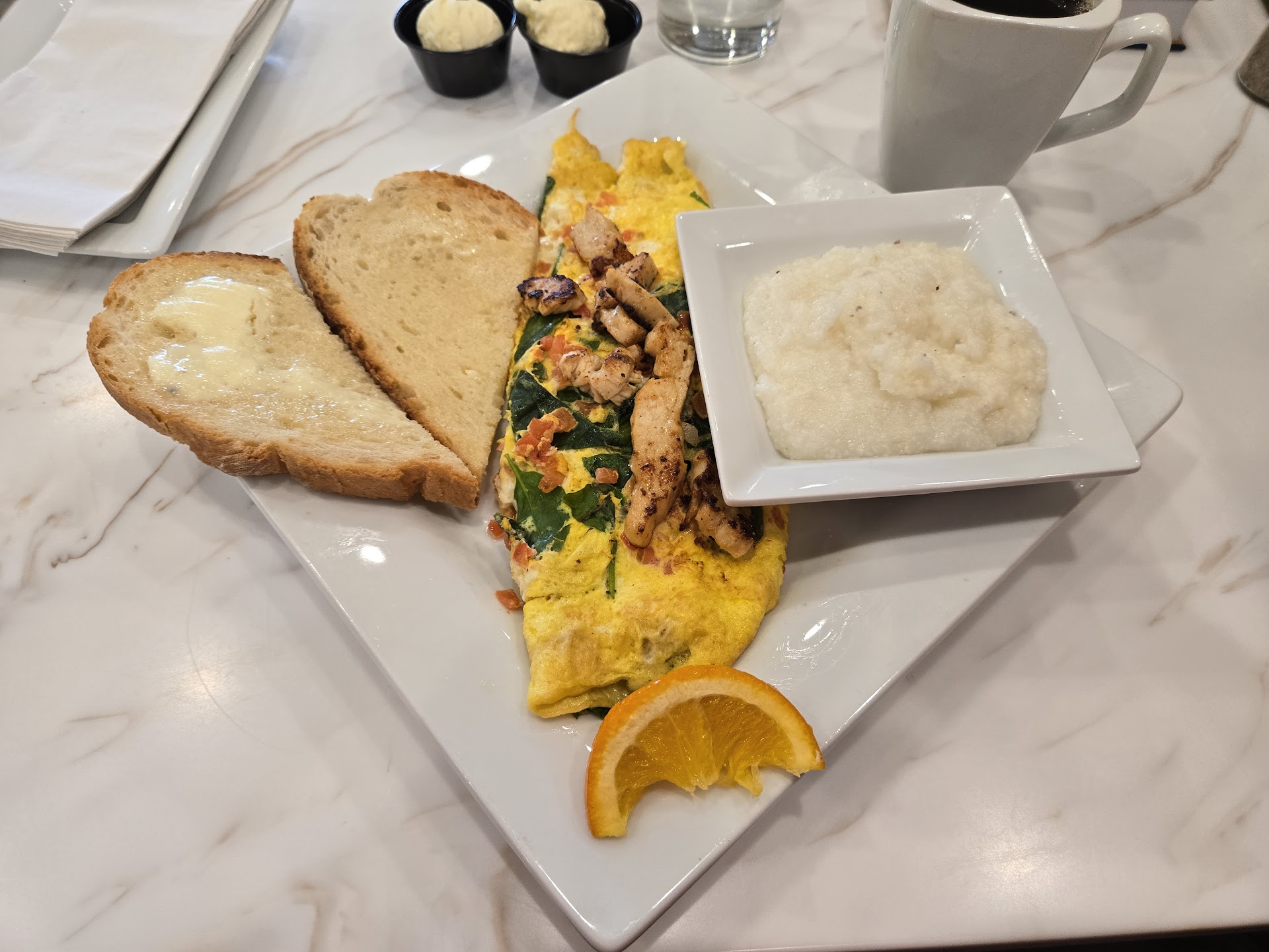 Our server, Mikayla, came back and explained that it would take longer since they had to make fresh grits. As we’re getting our food after closing. I told her not to worry about it—as I didn’t want to eat much later than my family, who had already started their meals. She insisted, so I agreed to wait for the replacement.