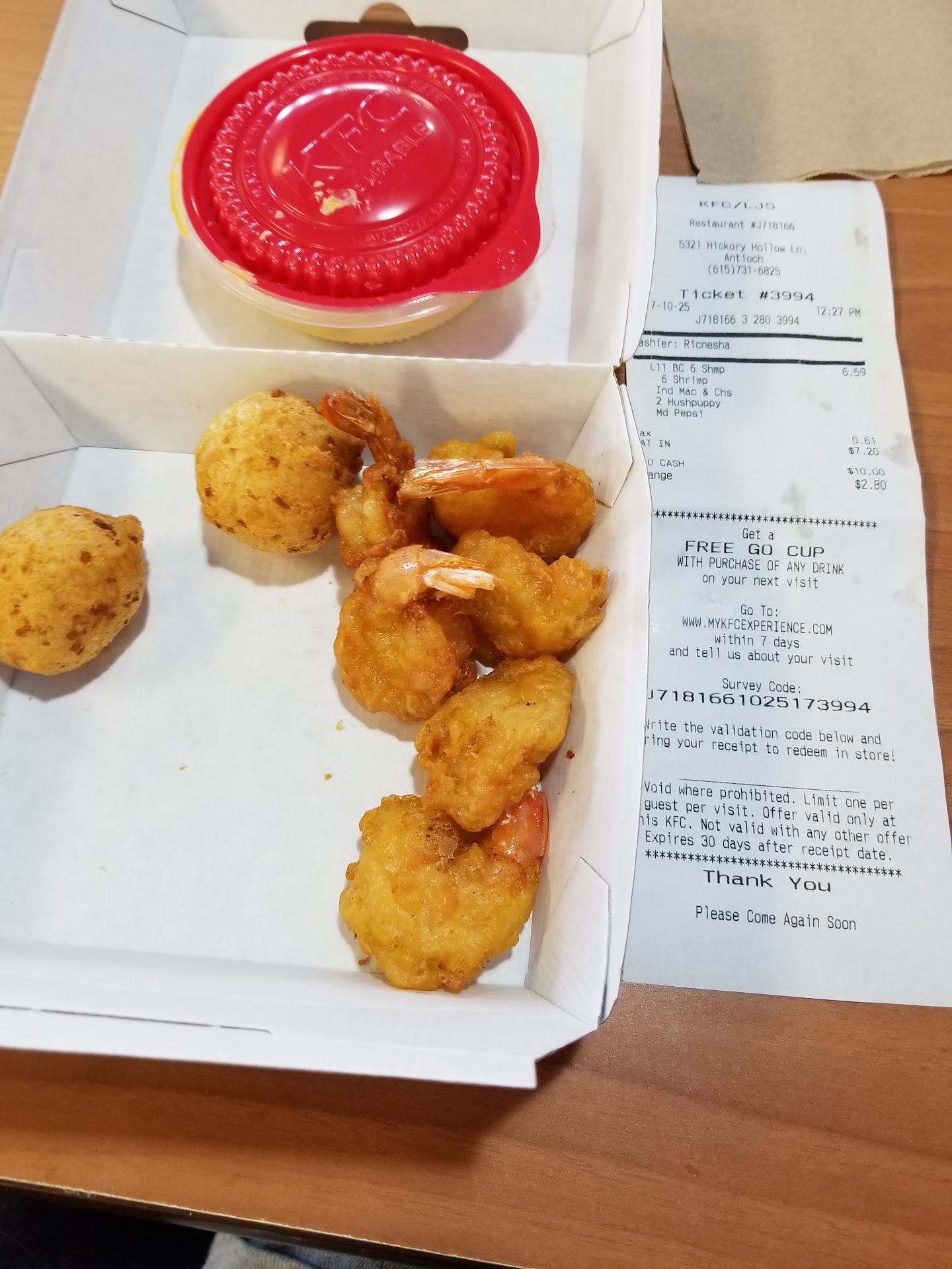 Read moreIf I could give them a half star I would, but that isnât an option!! This is the WORST location ever!! They are so ghetto and unprofessional! I went yesterday and we ordered 2 8 pieces. Extra Krispy! She rang us up assuring us that she had the chicken! She fumbles around for 10 minutes before she comes back and says there arenât enough breasts and we could only provide breast for one of the 8 pieces! Cool ... so we ask her to just put whatever is left in the second 8 price. She then fumbles around again for another 10 minutes to tell us she had NO BREAST AT ALL! She was wasting all of my time!! So we ended up getting chicken timders bc we donât eat dark meat! Not to mention, the manager and the cook were literally about to fight bc he took an extra break, thatâs why they had no chicken! As we are still waiting for them to bag the food for 20 more minutes, a woman comes in and says she has been waiting outside on her order for 25 minutes ! The manager screams OH MY GOSH in frustration like she was the one waiting on a meal...
