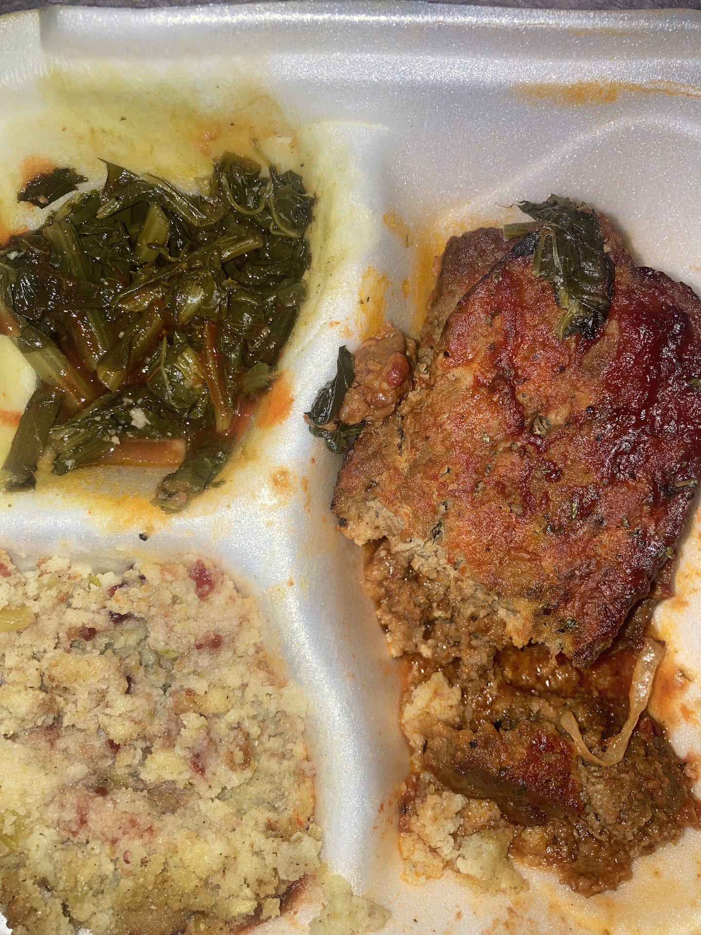 Read moreTried this place on Super Bowl Sunday and while the cashier was super sweet and polite this plate is HORRID. Please stop selling dressing, this mess is mushy and NO FLAVOR, these greens are also tragic with no real flavor, this meat loaf I have to drown in hot sauce just to get it down because nothing else is open and I spent $20 on a plate I can’t even finish. Please take these reviews to heart about your flavors. I saw some comment talking about he from the Mississippi Delta and he doubled back for some more dressing and all I can say is he ain’t got no tastebuds and ALL my ancestors, ( I am Mississippi Born and raised) would have cussed him from here to yonder telling that BOLD FACE LIE about it tasting like a Delta Grandmother made it. You could have kept that. Again your server was super nice and sweet but NO WONDER it was 6 going on 7 when I pulled up and MOST of their food was still unsold and they close at 8. I’ll eat a peanut butter and jelly and SAND sandwich before I spend...