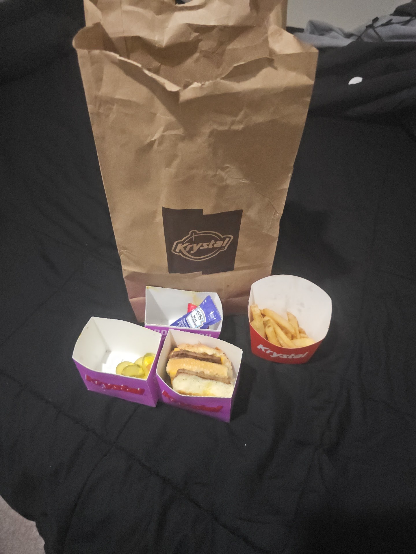 Read moreMy grandson and I had not had Krystal's since the location in Donelson shut down. Every time we drove past the empty Krystal building, we would say, I sure miss Krystal's. So, a couple days ago, I decided to Google the closest Krystal from my home, in a state of shock, I literally found a Krystal's within 15 minutes from me. Yesterday, June 11th I was having a really stressful day, not knowing what the future held. I have custody of my grandson, which is now 16, a great, respectable young man. I automatically stopped worrying about my problems. I told my grandson, let's go. He said, where are we going? I said, we're going to the Krystal. He was excited and so was I. We went inside and the smell of Krystal burgers was amazing 𤤠We placed our order with the nicest lady working the counter. We got our food and went back to the car. There was no way my car was moving, until we savored the flavor of a couple of Krystals with cheese, with extra mustard, a few fries and drink. We were totally satisfied đ we took the rest of our order home, so, we could indulge later. It doesn't take much to make my grandson and myself happy, however, yesterday was a blessing đ Now we know, we can have Krystals whenever we want. Losing our Krystal's in Donelson was devastating. We live in Hermitage, TN and would love to have a Krystal's in our area. But, at least we know Krystal's is not that far from home. Thanks to the staff's kindness, we had...
