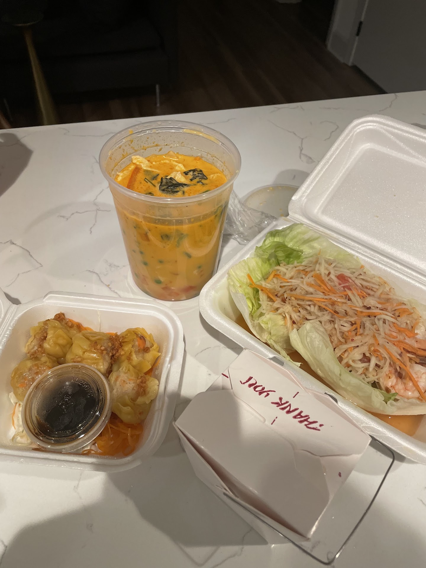 The food was damn delicious and we haven’t expected to have such huge quantities of food. They gave us delicious food even at the late hour and the whole gang totally enjoyed it. The soup we ordered might need some thick cocunut milk base but other than that we enjoyed our dishes. We ordered appetizer combo and enjoyed them. Chicken satay was good, chicken dumplings were amazing and the spring rolls were spot on. Coming to the entrees we ordered some pretty different dishes and ratings would go as below: Drunken noodles - 4.5/5 Pad Thai - 5/5 Red curry - 3.5/5 Green curry - 4.5/5 Fried rice - 4/5 Lemon grass fried rice - 5/5 Sticky mango rice - 4/5 Overall we had some good food. Don’t fear to go with spicy...