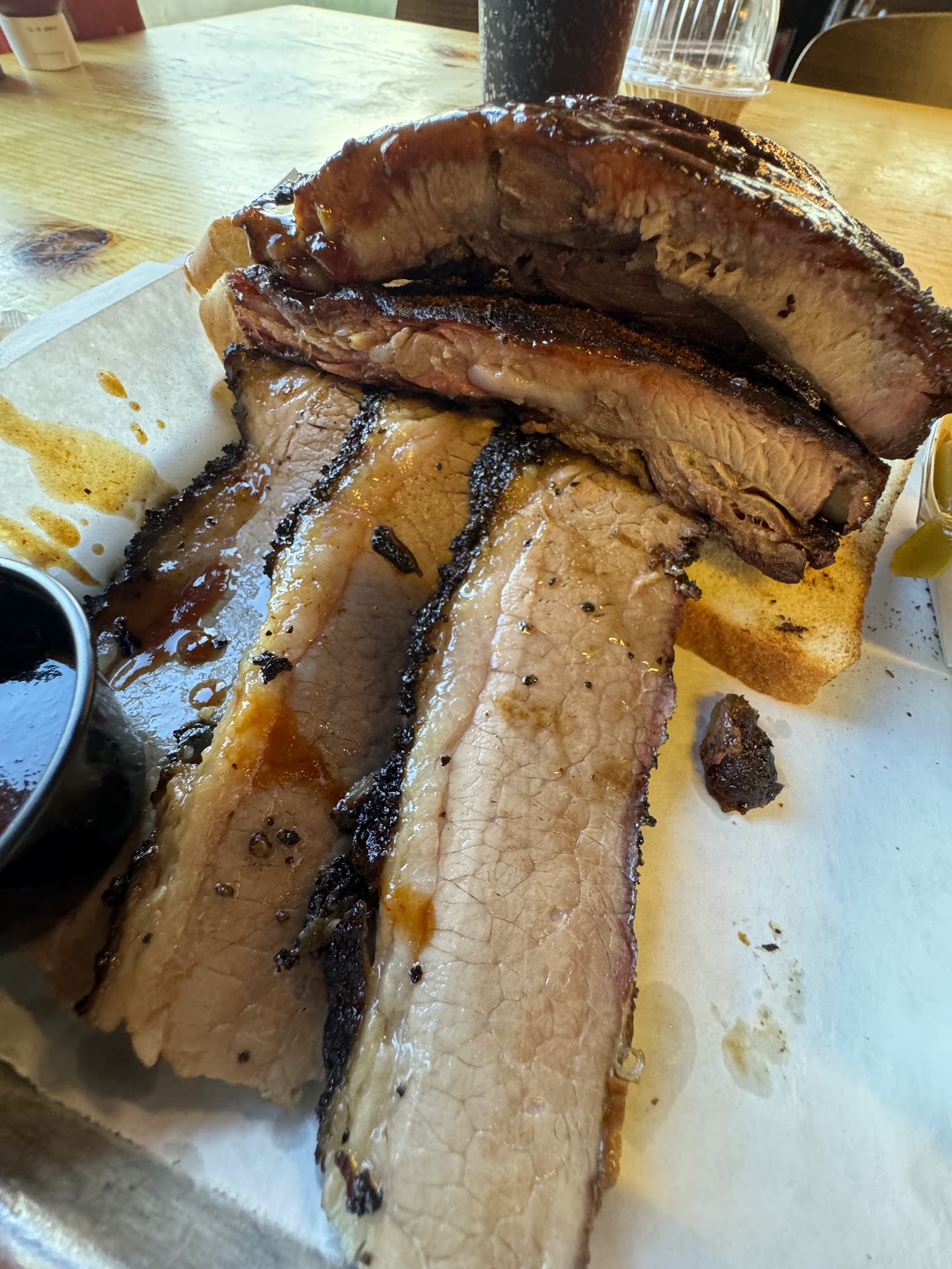 Read moreUpon visiting Martin's BBQ Joint in Nashville, Tennessee, I had hopes for a memorable BBQ experience, especially after ordering their Big Brother platter. This dish came with three slices of brisket, four ribs, and a helping of white bread, alongside two sides: a commendably tasty Mac and Cheese and well-seasoned green beans. However, the experience took a downward turn with the brisket, which unfortunately arrived undercooked and lacking the smoke flavor of real bbq, betrayed further by its lukewarm temperature, implying it had been sitting out. The ribs, on the other hand, suffered from overcooking, resulting in a lacklustre flavor profile that didn't meet expectations.