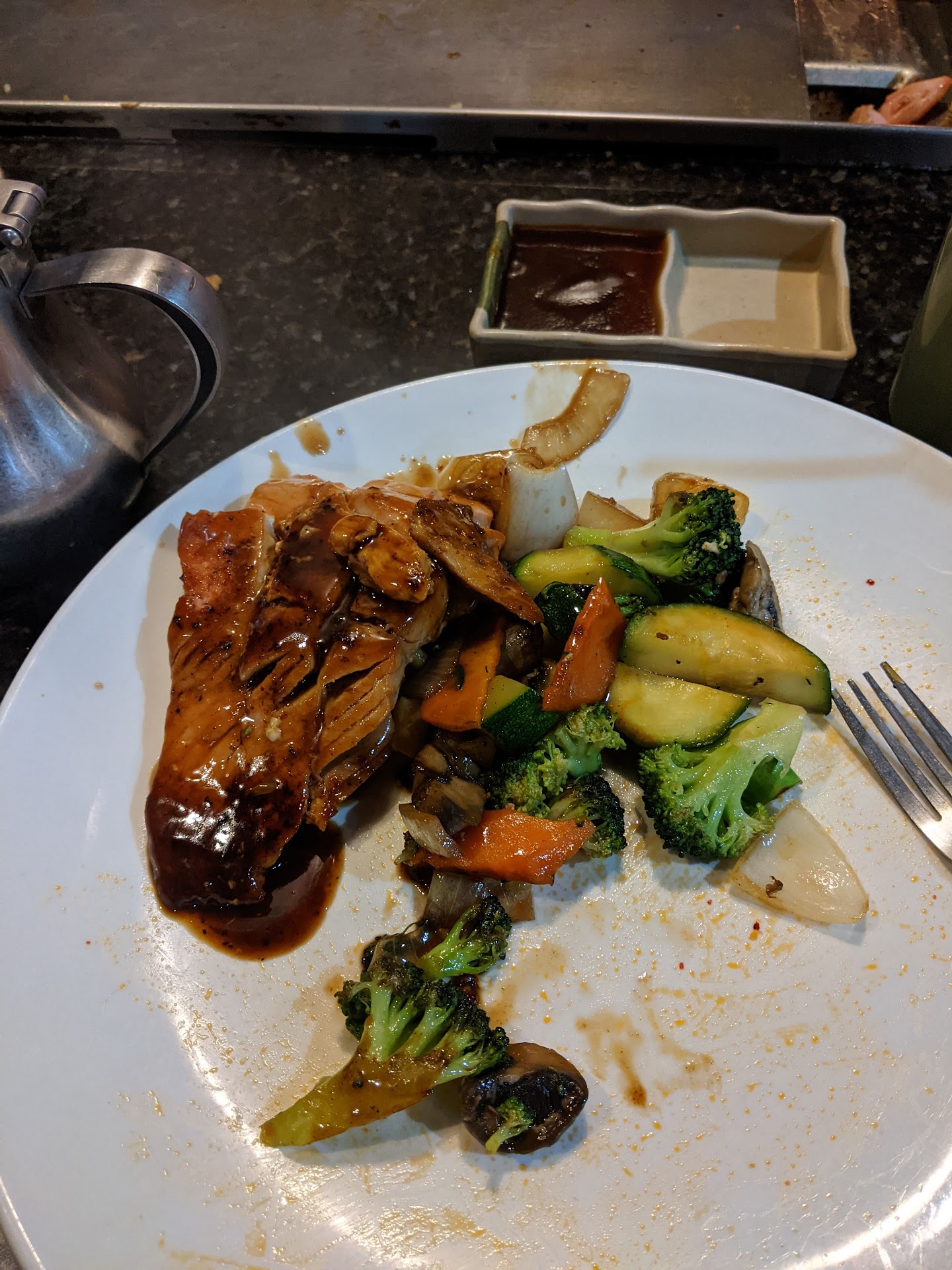 TIL that there is a difference between a professional chef and a professional hibachi chef. Both make good food, but the latter can entertain as well. It wasn't very busy when I got there around 5:30pm on a Sunday, and I asked to be seated at the hibachi grill. I noticed that there was still a wait to fill up the seats around the grill. While I waited, I ordered a "Japanese hot green tea" for $2.75, and it came with a little ceramic cup + tea pot (I suspect it was matcha; I liked it). I was also brought a complementary bowl of soup (possibly miso, or maybe a mushroom soup broth). Once all the seats around the grill were full and everyone had made their order (from a "hibachi" page in the back of the menu; I ordered the salmon for $19.95), the chef came out with a cart that had all the raw ingredients on it. He started by making an impressive (for me, at least; first time seeing it) display of his spatula and fork skills, flaring up something (possibly sake; it burned like alcohol, and I suspect the flame had a caramelizing effect, but I don't know for certain; it was hot and entertaining though (FIRE!)), and started the rice. I opted for the "spicy" fried rice, same with everyone else at the table (in the sense of "had spices"; contrast the Indian culinary sense where "spicy" = "raging inferno", which this rice was not). It was excellent, flavorful, had a hint of what my limited culinary vocabulary can only describe as "Mongolian grill-esque", and there was a lot of it. By the time I was done, I didn't have to wait long for a couple small shrimp that came complementary, and after that was the stir fry vegetables, and my salmon followed shortly after that. All very good food, and I left full. An 18% mandatory tip is automatically included when seated at the hibachi grills (not mandatory at other tables), but I thought he deserved more, so I added a bit extra on top all that. After taxes and tips my total for a single dinner was $30. Expensive, yes, but I'm on travel, and today I thought that it...