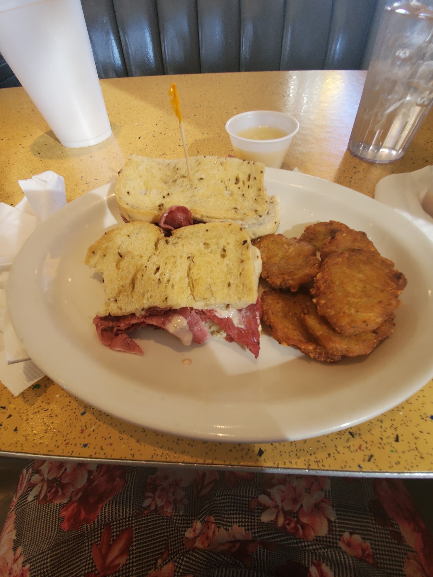 I arrived around 9:45, and I was seated immediately by a very fun host. My server was April, and she was kind, attentive, and even a little funny also. I ordered black coffee and water, as is my usual. They arrived quickly, and I ordered my breakfast: lox, eggs, and onions. I chose the everything bagel and to keep the potatoes as my side. This was an excellent choice! The potato cakes were perfectly crispy on the outside and tender on the inside. The lox, eggs, and onions paired wonderfully with the potatoes in what was just simply a perfect bite. As an afterthought, I think a touch of sour cream may have topped it off, but it really didn't need anything else. They have it and I totally could have ordered some. I might next time. The lox was so delicious that I ordered some extra to go with my everything bagel I am taking home.