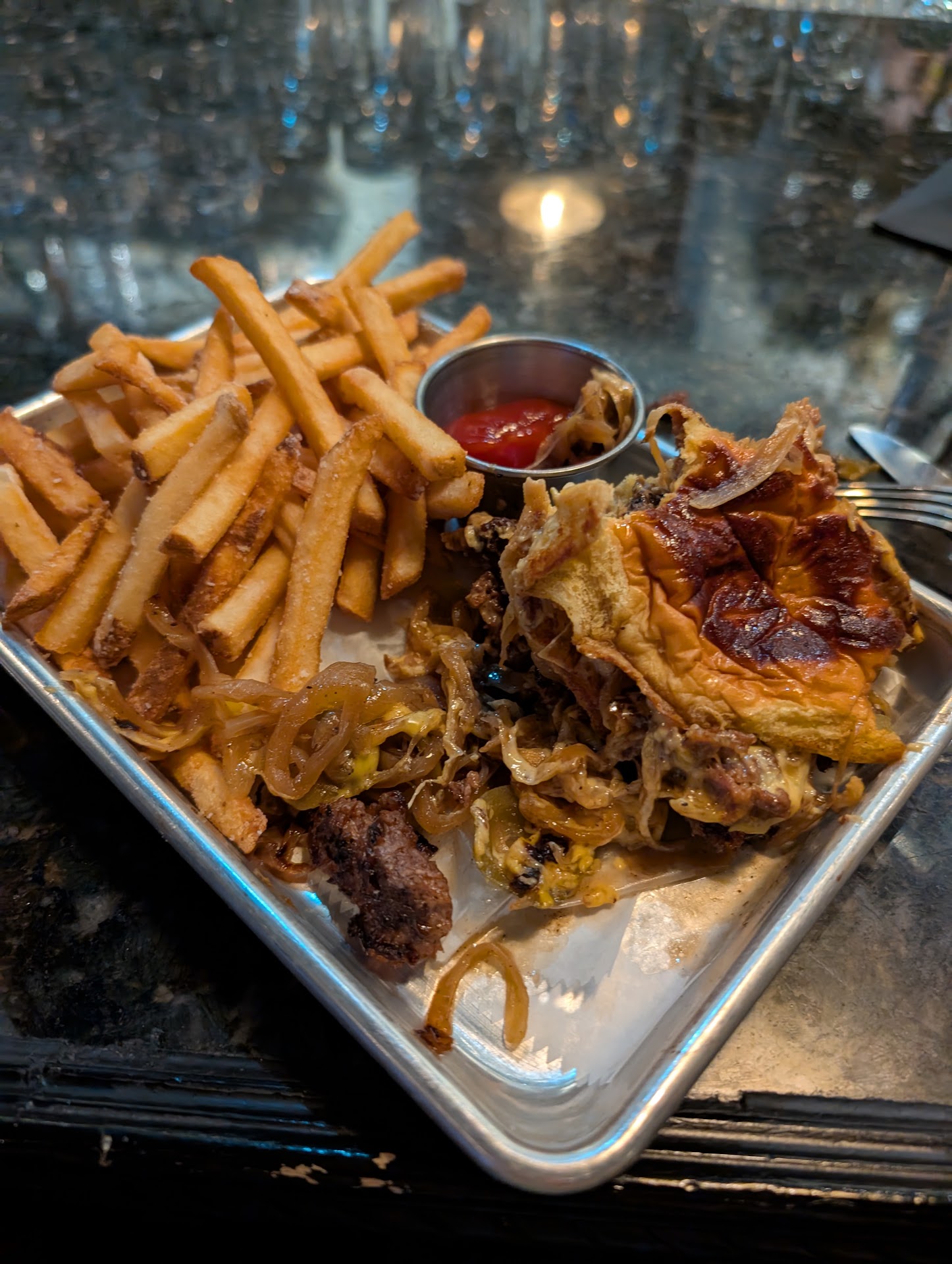 In a town with Attaboy and The Patterson House, it has no business labeling itself as a cocktail bar. The drink menu is underwhelming, but I was intrigued by the mezcal drink, curious about the bulgogi added into the syrup. I eat bulgogi on a regular basis, but this drink had no subtlety and tasted like a basic tequila lemon drop, mezcal not high quality, and presentation and flavor extremely mediocre, all for $12. Then the $18 burger...it promptly fell apart as I picked it up. The patty was so overcooked that it just became a bunch of dry beef pieces. The bun was soggy and mushy. What a mess! I ended up eating it by scooping up pieces with a fork...