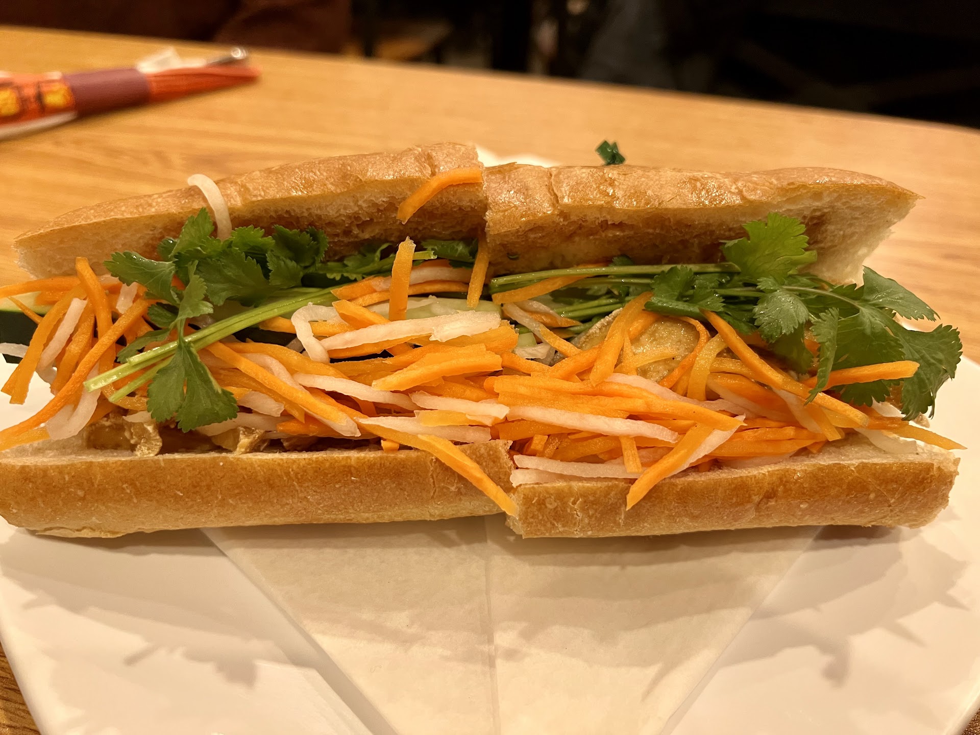 The tofu banh mi was excellent, with beautifully seasoned and spiced tofu and veggies on a soft baguette.