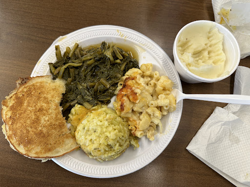 Let me just start by saying thank you to the universe for leading me to this place. When I tell you I was ravenous I was the most ravenous I've been ever.... so because of that I was less than adventurous when I made my food selections. I ordered Fried Chicken, macaroni, cabbage, and two corn cakes. The chicken was crispy and juicy with that classic fried chicken flavor. If you love classic Fried Chicken this is it. It's not spicy but I completely enjoyed it It was really good. The Cabbage was perfect it was seasoned it was flavorful it was cooked to the perfect tenderness and did not taste like it had been sitting there all day it tasted really fresh. The macaroni was creamy and delicious. And I am so happy I ordered two of those corn cakes, cause I ate one in the car. That's why there's only one in the picture. I generally don't like other people's cornbread because it's really dry but this was moist and really tasty. I was also given a slice of this strawberry cake which I never would have selected for myself but holy smokes it is so good. I cannot wait to go back to this place it is so good like so good. The service was great as well, friendly people with smiling faces....what more could u ask for? Do yourself a favor and...