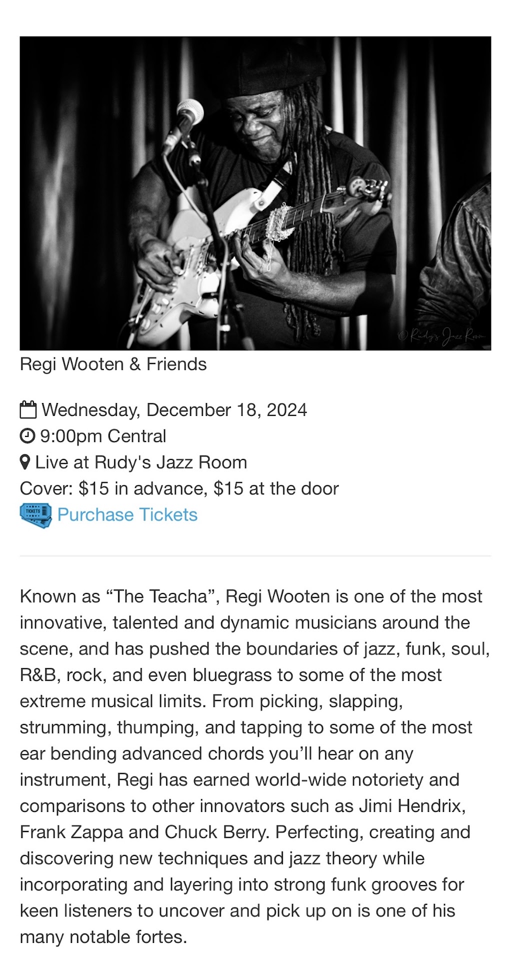 First timer and I had a gift certificate from last Christmas and it’s Christmas time again🌲 . So it’s a good time to use it. “Key” (Keira), was the second person we came in contact with here. She is a SUPER HOSTESS! First class lady. And I don’t want to forget Linde who answered my emails speedily and made our reservation. I met her via email. Then I met Matthew, a famous Bartender who takes pride in being a mixologist. We also met the Manager of the evening, “Jana”. She’s very personable, friendly and knowledgeable. We stayed for 2 shows. The first one was Christmassing: New Classics for the Old Soul feat. LaLa Deaton & Blue Champagne . And the second show was Regi Wooten and friends. The ambience reminds me of a speak easy bar room. Dim lighted room and romantic I’d you are, or on a date. :-). Our server is Trey and John. Trey is personable, friendly and honest. ( I say that because I asked what would he suggest for dinner.). Thanks Trey! John forgot that we had ordered a drink and remembered later in the show. We had the fried pickles, Gumbo, and, po’ boy shrimp sandwich and side salad. Fried pickles was a plentifully serving for 2 people. I got a bowl of Gumbo. I disappointed because I was looking for the andouille sausage, shrimp, and, chicken. Mostly soup with 2 scoops of rice. Well It got left out of my bowl :-( My husband had a shrimp Po’ Boy . He was disappointed because he said that he got maybe 4-5,shrimp and his sandwich was mostly bread. Not like the Po’ Boy sandwiches that we have in Nola. I will say that the salad was good. I wouldn’t order food off the menu again because I was expecting to get more for my money. It’s not cheap! It’s not expensive neither but you would think you would get More for your money. Overall I gave it 3 stars because the food was subpar, and the drinks are pricey. The bathrooms were clean and personally it could use a facelift. The chairs are worn and tattered tables are very very small inside. Maybe enough for one person to eat on, but that’s what you would expect in...