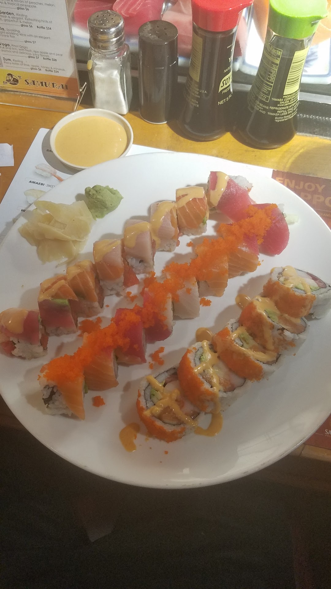 (The food they serve is only sushi. Unlike other Japanese sushi restaurants, Samurai strictly works with sushi. It is their specialty. So if you're looking for foods that are hibachi-style like teriyaki or bento and you're not much of a fan of sushi, this place is not the place to go. However, if you haven't tried sushi and would like to, this is a great place to start.)