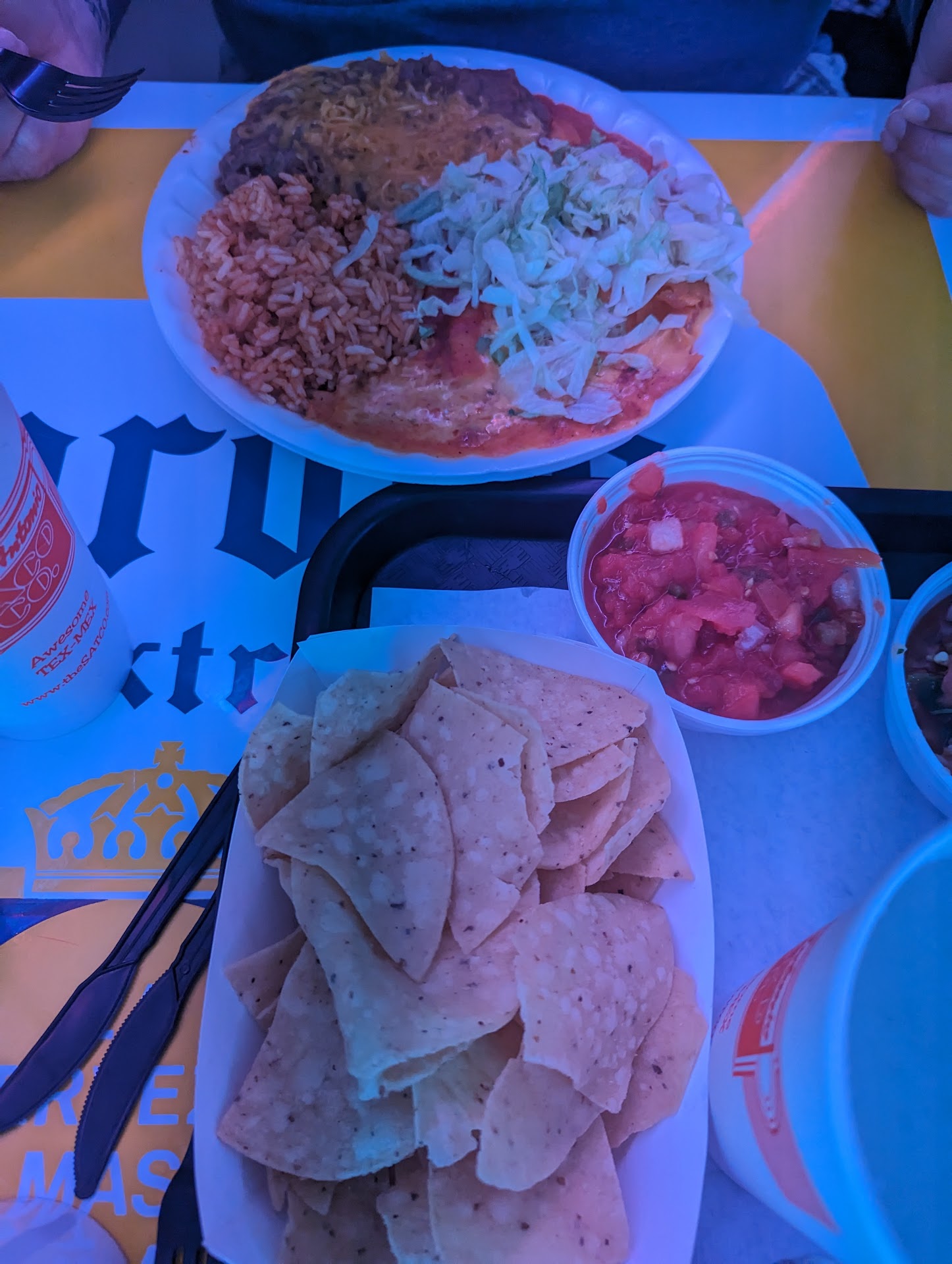 I'm torn with this place because the food is good, but it was hit or miss for some. The tacos are similar to taco Bell sized soft tacos and the crunchy tacos were full, but it says they recommend two toppings, but yet charge for all toppings. And I get it's only .25 a topping (sour cream is .40), but you should have two complimentary toppings like lettuce, tomato, or cheese and then charge for the onions, peppers, etc. Otherwise, it's just an expensive taco. The enchilada plate was very cheesy and saucy. Don't get me wrong, that is not a bad thing. But, it was a bit sloppy albeit tasty. I wouldn't get it again though. The beans were tasty though. Bean and cheese taco did it for me. Very tasty! The queso was good and you have a salsa bar with pico and salsa. The staff were friendly as all get out though. Very welcoming and friendly all around. From bringing us salsa to our table, cleaning up trays, taking our orders, holding the door. They have excellent customer service.