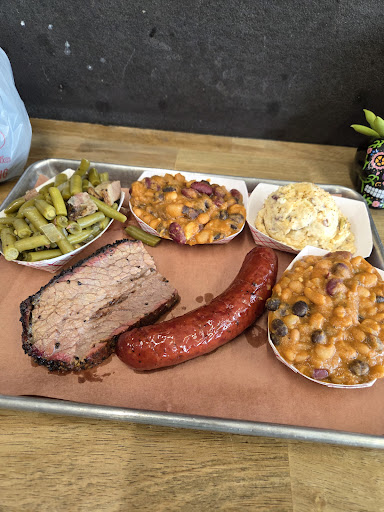 The food is excellent.. the brisket had a well developed bark on it without drying out. The hot link was good. The pit smoked beans are great, they have a little bit of a mustard/vinegar tang that I really enjoyed, they're definitely not traditional baked beans if thats what you want. Green beans were good. The dill potato salad was awesome.