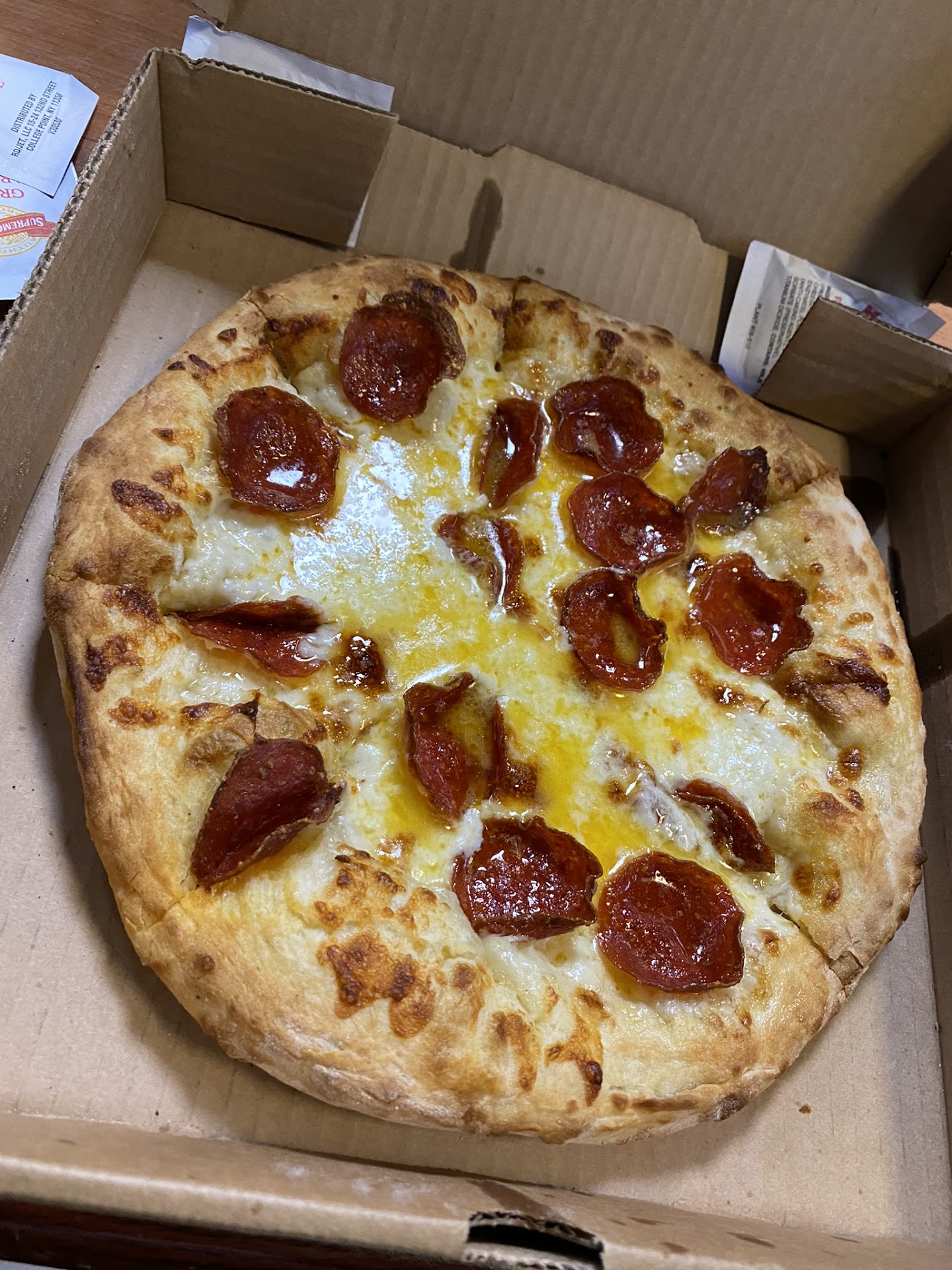 The atmosphere was that out of Clerks and full of disappointment. There was a sense of defeat coming from the girl behind the counter. (Not adhering to Covid19 guidelines. No Mask, or even gloves.) She handed me the pizza when it was done and I took a quick glance to inspect it. Yep, that's a cheese pizza alright. $15.99 Price point. I recognized the box from a Postmates order I got a while back, so i was braced to be disappointed. Bamboozled again!