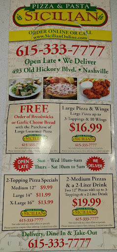 Read moreThis is one of the strangest reviews I've ever written because I have never eaten here, and for all I know the food and service is outstanding. However, I had to say something about one of their delivery drivers. This kid was driving incredibly hazardously in the rain, cutting off other cars, slamming on his brakes in front of them, recklessly swerving all over the road, driving down the middle of both lanes, passing people around solid striped lines, etc. I witnessed a truck honk at him after being cut off, so he moved over into the right lane and slowed down, but then as the truck tried to pass him he swerved toward them as if to hit them and then righted his car and sped off. (Picture was snapped right after he pretended to hit silver truck and then sped away.) I honked at him after he cut me off so he slammed on his brakes and got next to me and flipped me the bird. Pretty asinine behaviour, especially considering he's driving around with his employer's name and phone number plastered on top of his car for the world to see. I'm sure the pizza is great but he really set a bad first impression for me and everyone else on the road with him. Ironically, I just read a different review, 5 stars, claiming that they were impressed at how fast their delivery order arrived, so fast they wondered whether Sicilian Pizza owned racecars. Apparently their delivery order arrived so fast because their driver left a trail of havoc and road rage in his path to get there in record time. Also, I couldn't help but notice on these Google reviews that the owner gives out a 10% discount for life to anyone who gives a five star review, but never bothers to reply to or address any concerns of others. I'm getting the impression that this is a pretty tactless operation starting from the owner all the way down the line to the drivers, regardless of the quality...
