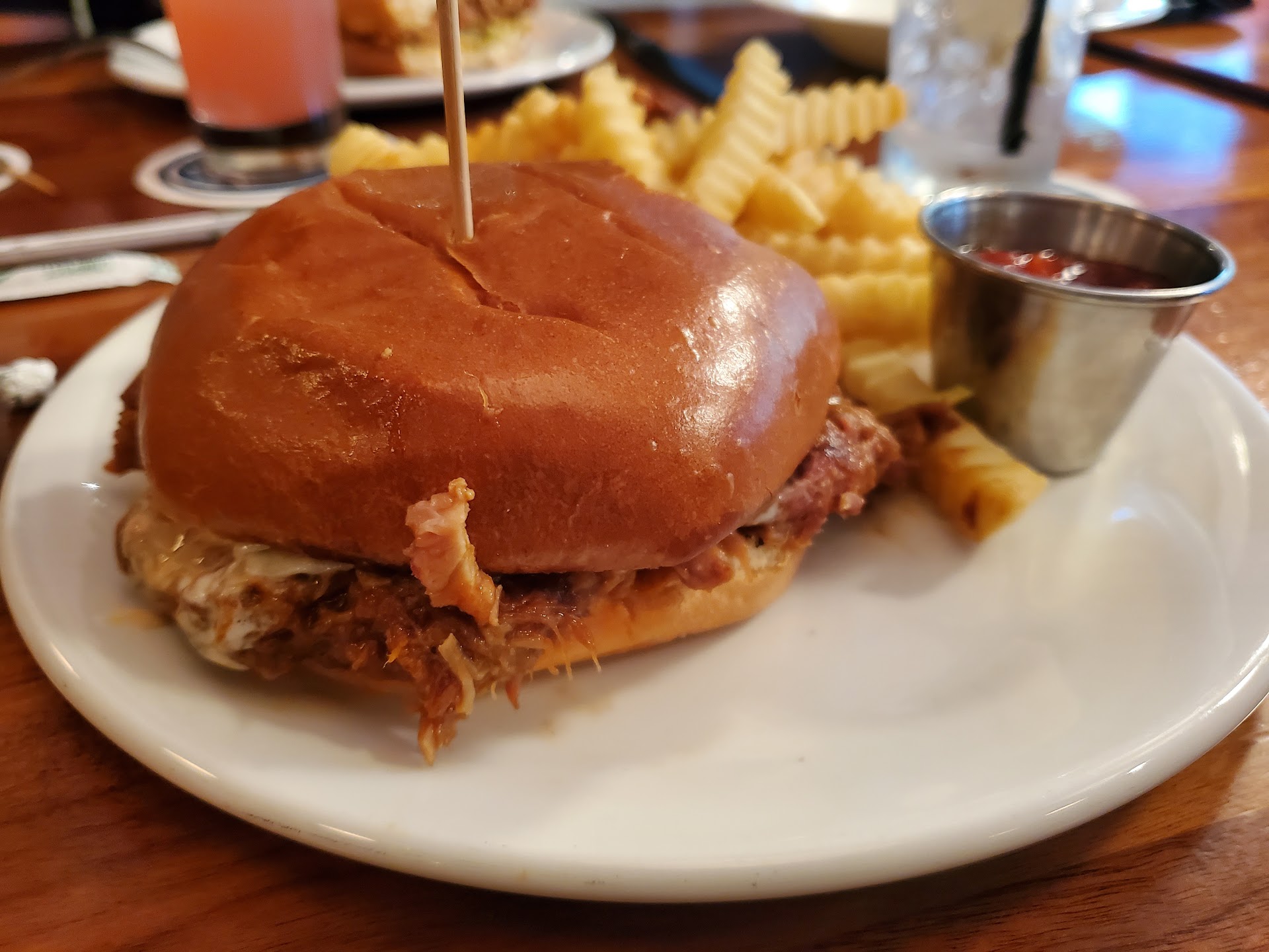 For a hotel bar/restaurant it's not bad especially in a pinch. Their bar top seating area is well sized and organized with a few large screen's to watch sports/news. The staff is very friendly and they have a small happy hour snack area set up serving light snacks (a good value added to the stay). They highlight area craft beers on tap (about 10 drafts) and have a full spirits selection as well as wine (house specials as well).