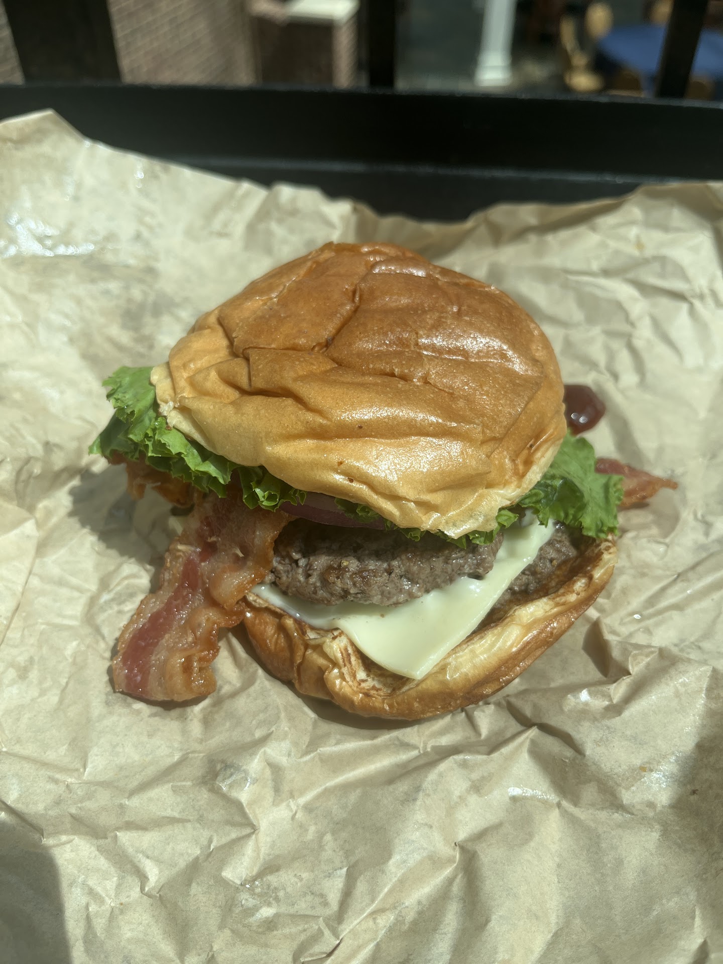 Burger with Bacon: 4.9/10 The burger, while featuring fresh ingredients and crisp bacon, offers only a basic taste experience. The use of a standard Heinz BBQ sauce from a self-serve dispenser detracts from the gourmet potential of the dish, making it feel more generic than expected, especially given the setting. The bun also fails to elevate the burger, described as "nothing special."