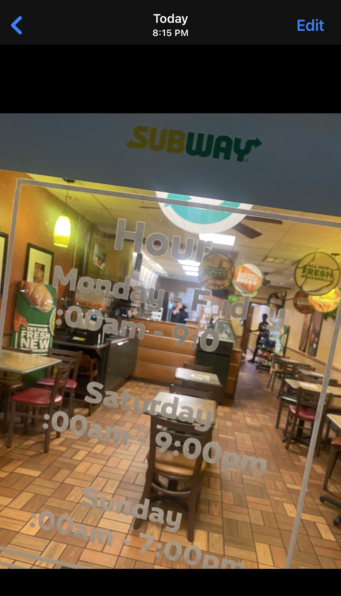 Read moreVery disappointed with my last order. I ordered through Postmates. The sandwich was very messy and made it so hard to eat. It was also so bland because they left out numerous additives. It was missing cheese, oil blend, bell peppers, mayo, salt and pepper and oregano and was not toasted as requested. Missing that many requested ingredients is not just a mistake. That's pure laziness and carelessness. It baffles me that someone could purposely ruin an order because the customer is not present and instead used a delivery service. They were also out of all bread except for wheat. The bread was so bland and hard that it literally gave me a headache after eating it. It probably wouldn't have been as bad if it was toasted as requested. I was really looking forward to a nice yummy sandwich, but instead I got $10 bland sandwich and a headache. My order was placed around 8:20 PM...