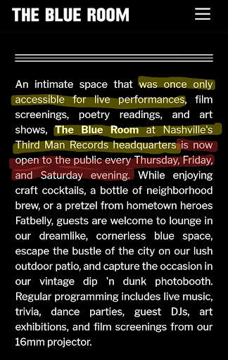 We were in town for the weekend and in the area, so we walked to The Blue Room on a Saturday night. It started pouring down rain halfway through the trip but we kept walking anyway. We got to The Blue Room, nestled right nezt to Third Man, and yanked on the giant door. Nothing. We dipped under the roof at Third Man and checked the website. Oh, they don't open until 7 and it's 6:50. No biggie, let's wait here. So we stood in the cold, surrounded by rain, waiting for 7 to roll around. Let's give them another few minutes just in case. 7:05...go to the door...tug tug, no movement. So what gives? We dip back under the roof. Let's check Facebook and Instagram...maybe they're not open today for some reason. Nothing to be seen. Okay well maybe this isn't the entrance? We walk around the block, in the rain, past multiple sketchy individuals, and find nothing else. Now it's 7:20. I call the number on site. It rings, rings, rings, and then disconnects. We go back, pull on the door again. Nothing. So eventually we just got an Uber back to the hotel.