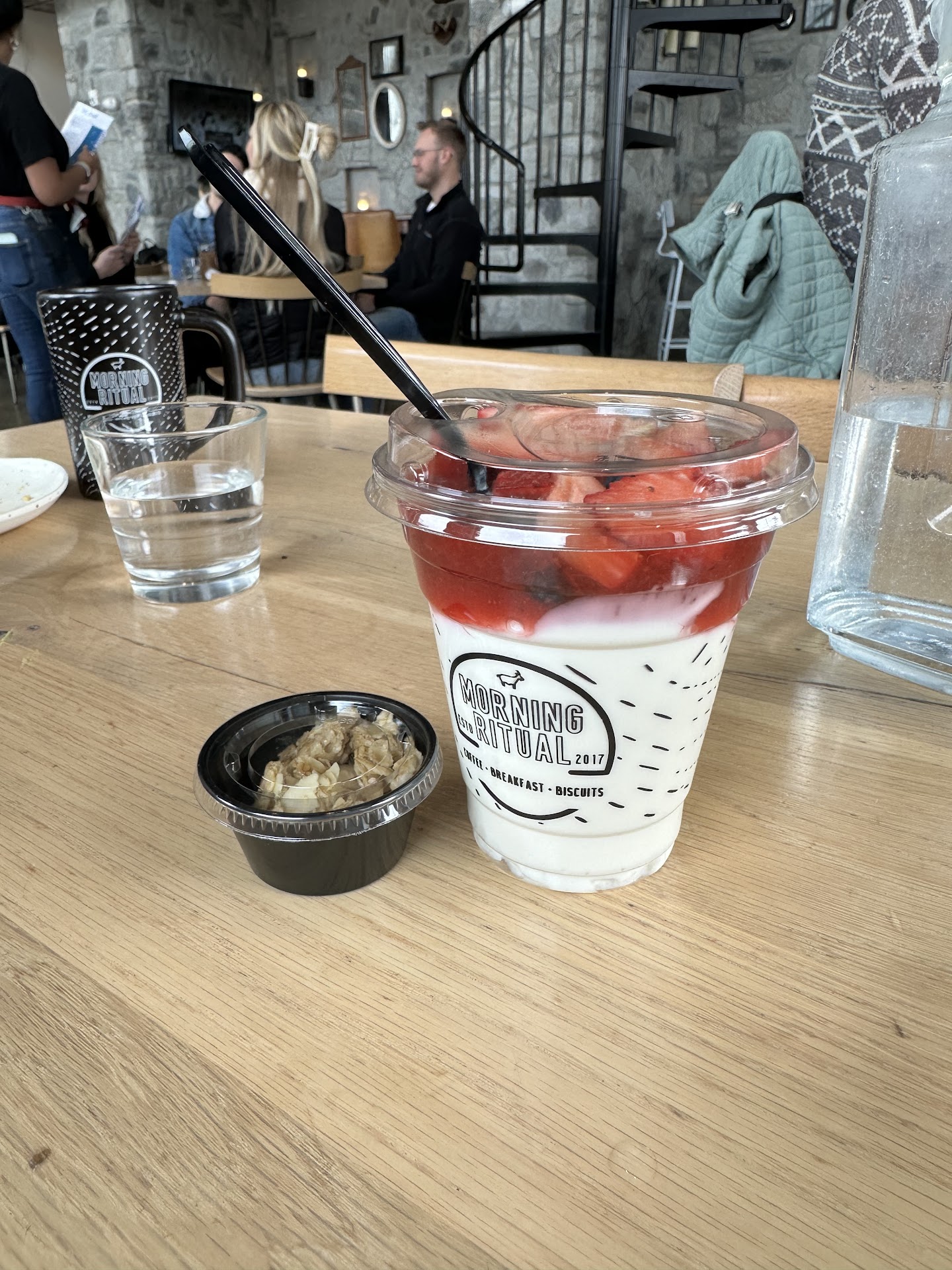 I don’t know if the mugs are too thick and cold or if the coffee is not hot, but we never got anything better than tepid coffee at the table, the breakfast burrito was all right, and our fresh fruit and Greek yogurt parfait was delivered in a cup with a plastic spoon and super sparse on fresh fruit. Mostly covered in a gelatinous strawberry gel. The orange juice is also a very cheap option made from concentrate and filled with added flavoring.