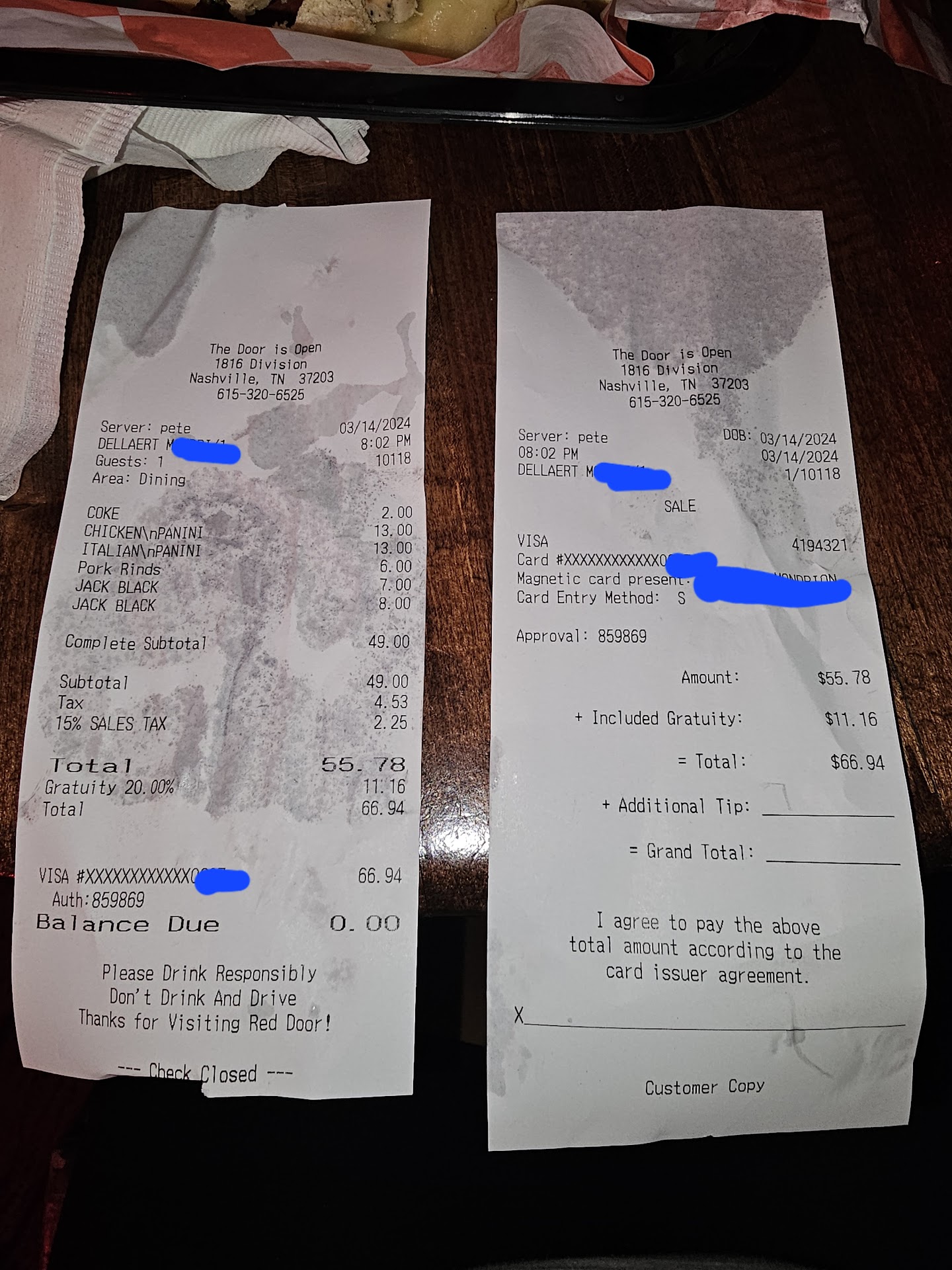 8:15ish, i get a notification that i spent $80.33 at red door, which was confusing as we ARE STILL HERE(3/14/24). So i, went to ask what happened, because after we ordered our food, our tab was $46, so how did i spend $80.